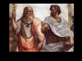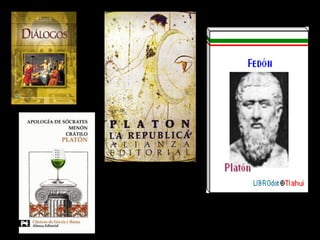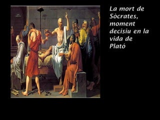 El pensament dePlató : Rep influència de Pitàgores, Parmènides, Sòcrates: els tres es caracteritzen per la defensa de principis de valor universal i permanent i prioritzen la fiabilitat de la raó davant la informació dels sentits. Reacciona contra els sofistes perquè aquests defensen el relativisme i l’ escepticisme. Obres : són diàlegs La més important : “ República”.