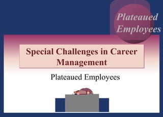 The document discusses special challenges in career management, including plateaued employees, socialization and orientation, dual-career paths, plateauing, skills obsolescence, balancing work and life, coping with job loss, and dealing with older workers. It focuses on plateaued employees, defining them, the types, sources and symptoms of plateauing, and the role of HR managers in addressing plateaued employees. It also notes that companies should help employees balance work and personal lives or they may leave for other jobs.
