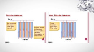 The plate and frame filter press uses alternating plates and frames to filter slurries. As the slurry passes through the filter cloth on the plates, the solids form a filter cake in the frames. Multiple plates and frames operate in parallel to provide a large surface area for filtration. The filter cake can be washed by including additional washing plates that allow wash water to pass through the cake. While effective for high value products, the plate and frame filter press has high costs and requires significant labor to operate.