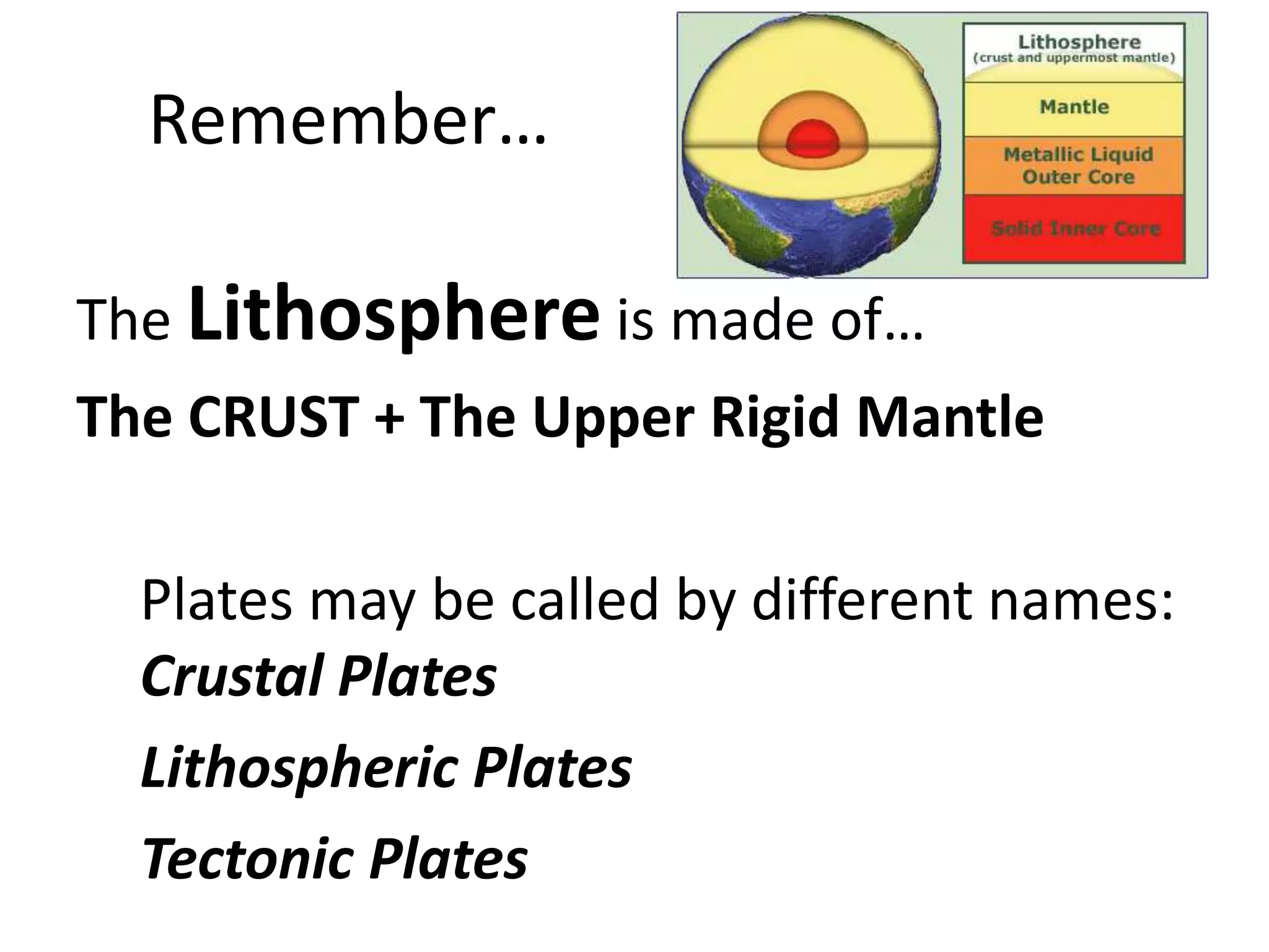 This document discusses plate tectonics and the three types of plate boundaries: divergent boundaries, convergent boundaries, and transform boundaries. It describes how each boundary type results in different stresses on rocks and the formation of different geological features. Divergent boundaries result in tension stresses that cause normal faults and the formation of rift valleys or sea floor spreading. Convergent boundaries result in compression stresses that cause reverse faults and the uplifting of folded mountains or subduction zones and volcanoes. Transform boundaries result in shearing stresses that cause strike-slip faults like the San Andreas Fault in California.