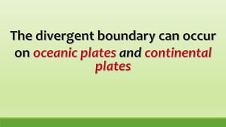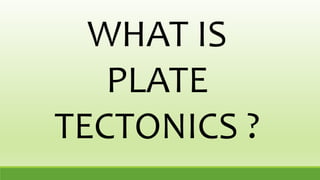 The document discusses plate tectonics and describes how the Earth's lithosphere is broken into plates that move over time. It explains that plate tectonics built upon Alfred Wegener's theory of continental drift, which proposed that the continents were once joined together in a supercontinent called Pangaea. There are nine major tectonic plates and three types of plate boundaries - divergent boundaries which create mid-ocean ridges and rift valleys, convergent boundaries which cause subduction and mountain building, and transform boundaries where plates slide past each other like the San Andreas Fault. Convection currents in the Earth's mantle provide the driving force for plate movements.