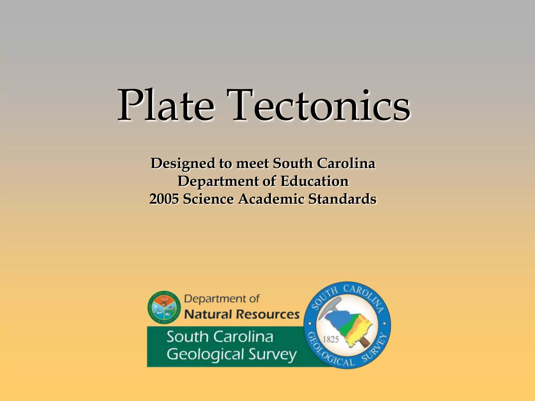 This document provides information about plate tectonics and is designed to meet South Carolina science standards. It discusses the layers of the Earth, tectonic plates and their movement, and the three types of plate boundaries - convergent where plates collide, divergent where they separate, and transform where they slide past each other. Specific examples are given for each boundary type, including discussions of sea floor spreading at mid-ocean ridges, subduction zones creating volcanoes and trenches, and the San Andreas Fault as a transform boundary.