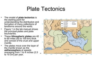 The document describes plate tectonics and the evidence that supports it. It explains that lithospheric plates move over the asthenosphere at different plate boundary types - divergent boundaries where new crust is formed, convergent boundaries where plates collide and cause subduction or mountain building, and transform boundaries where plates slide past each other. It provides examples like the Hawaiian hotspot chain that demonstrate plate motions. The document concludes by outlining an exercise to interpret a hypothetical tectonic map and identify plate boundaries and features based on earthquake and age data patterns.