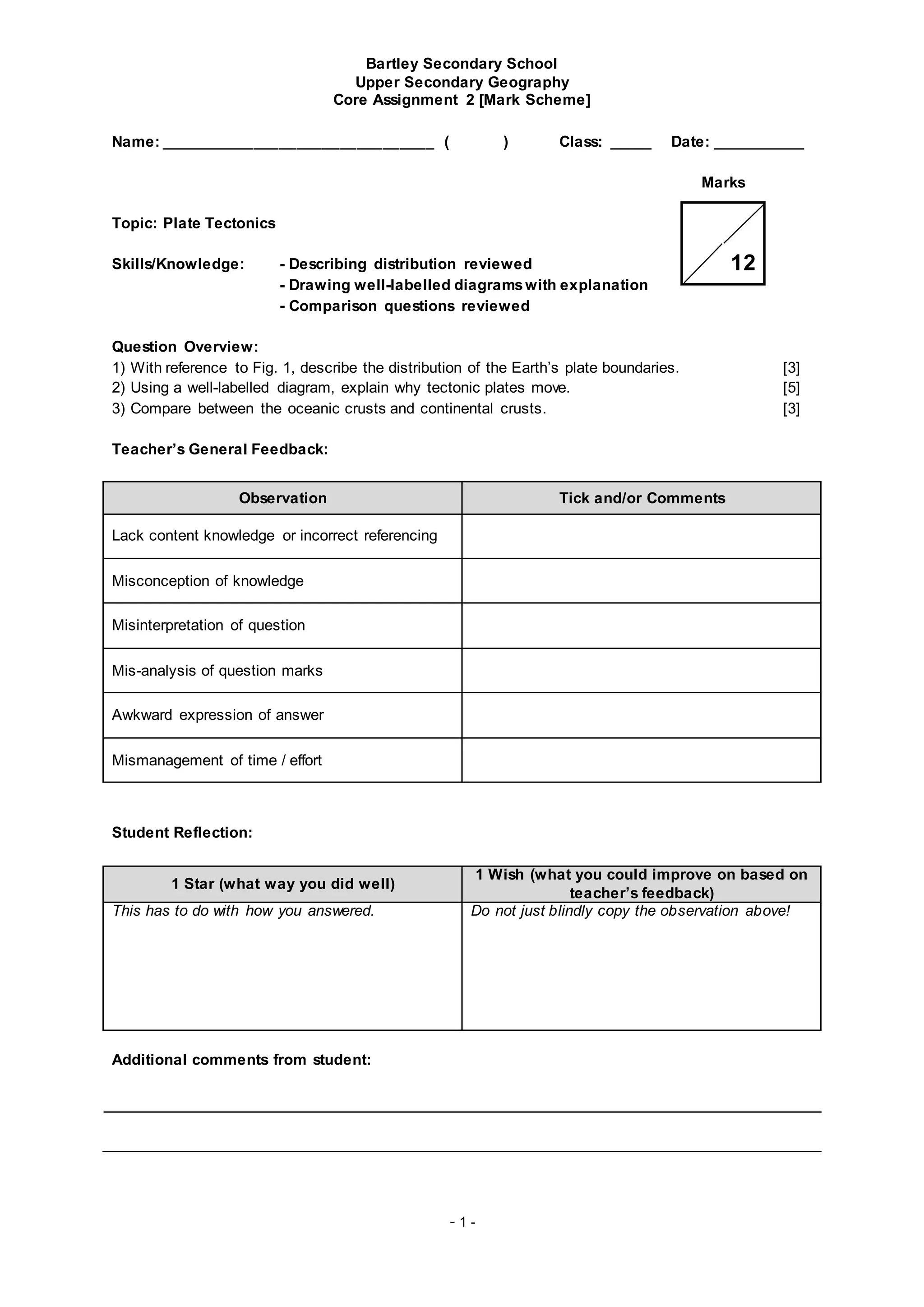 1. The document is a mark scheme for an assignment on plate tectonics given to secondary school students. It provides an overview of the assignment questions and feedback areas teachers will focus on.