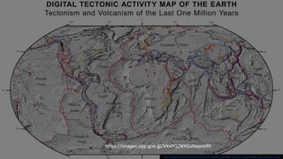 Plate tectonics refers to the movement of tectonic plates that make up Earth's surface. There are several types of plate boundaries that control this movement, including divergent boundaries where plates move apart and new crust is created, convergent boundaries where plates collide or one slides under the other, and transform boundaries where plates slide past each other horizontally. Volcanic activity is most likely to occur above subduction zones, where one plate is pushed deep into the Earth's mantle. The movement and collisions of tectonic plates over millions of years have shaped Earth's surface and continue to cause geological events like earthquakes and volcanic eruptions.