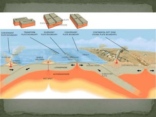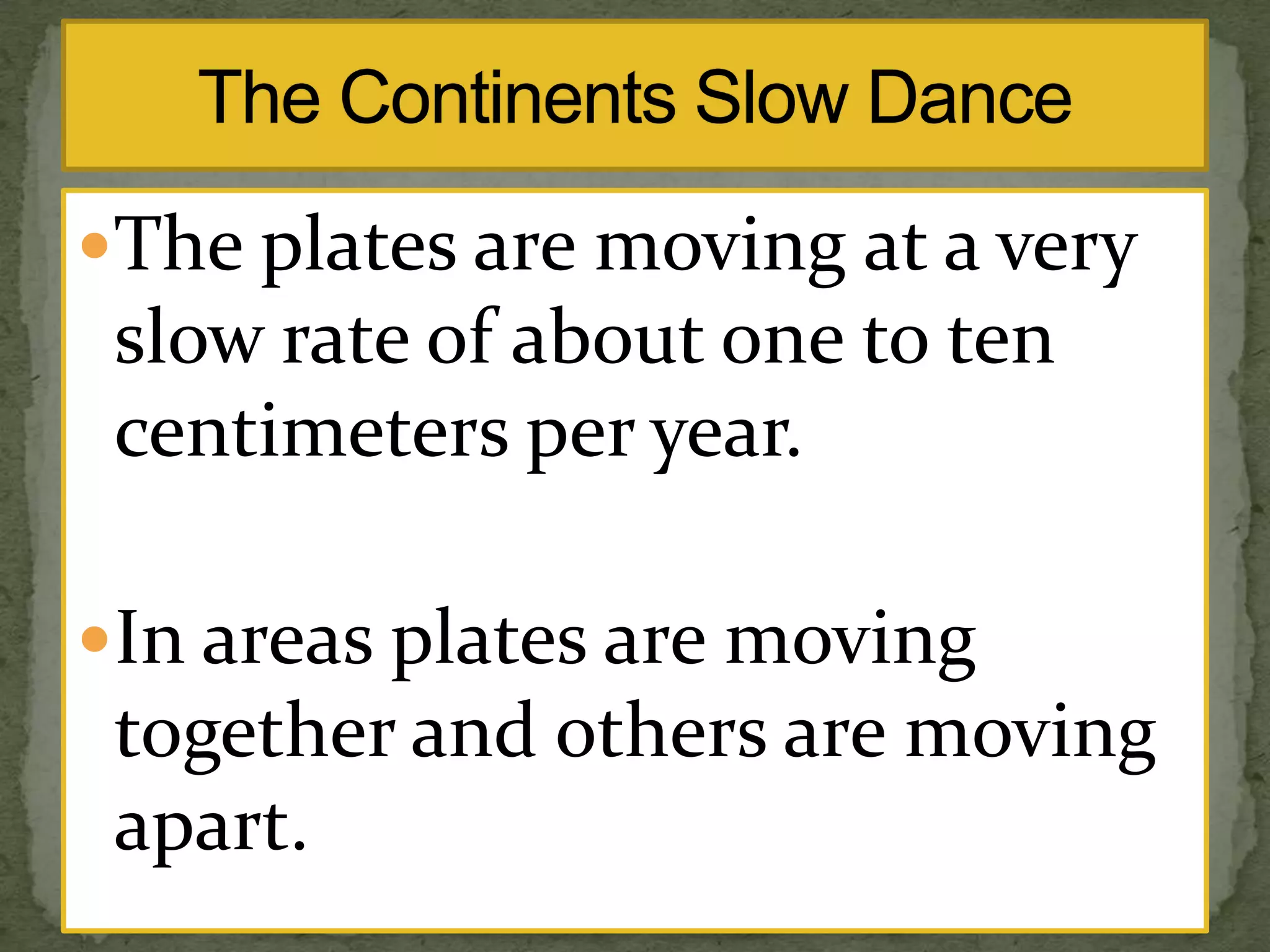 The plates are moving at a very slow rate of between one to ten centimeters per year. In some areas plates are moving together through a process called convergence, while in other areas they are moving apart. There are three main types of convergent boundaries: continental-continental, continental-oceanic, and oceanic-oceanic. At convergent boundaries, one plate dives beneath the other through subduction, which can cause volcanic activity at the surface.