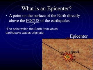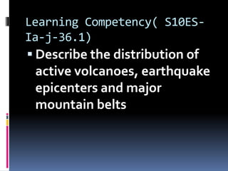 The document discusses plate tectonics, explaining the theory that the Earth's lithosphere is divided into tectonic plates that move independently. It covers the types of plate boundaries—divergent, convergent, and transform faults—and their geological effects, including earthquakes, volcanic activity, and the formation of mountain ranges. Additionally, it highlights the importance of locating earthquake epicenters for assessing damage and planning disaster response while introducing the concept of hot spots where volcanoes can form away from plate boundaries.