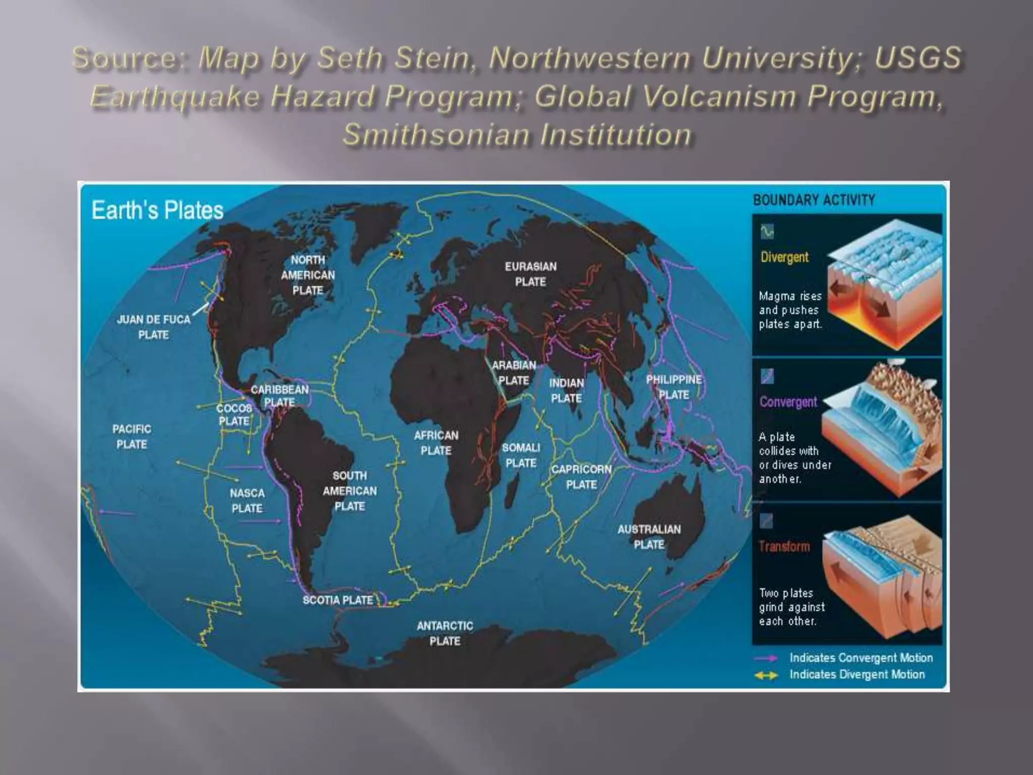 3) The three types of plate boundaries and associated geological features like ocean trenches and volcanic activity.