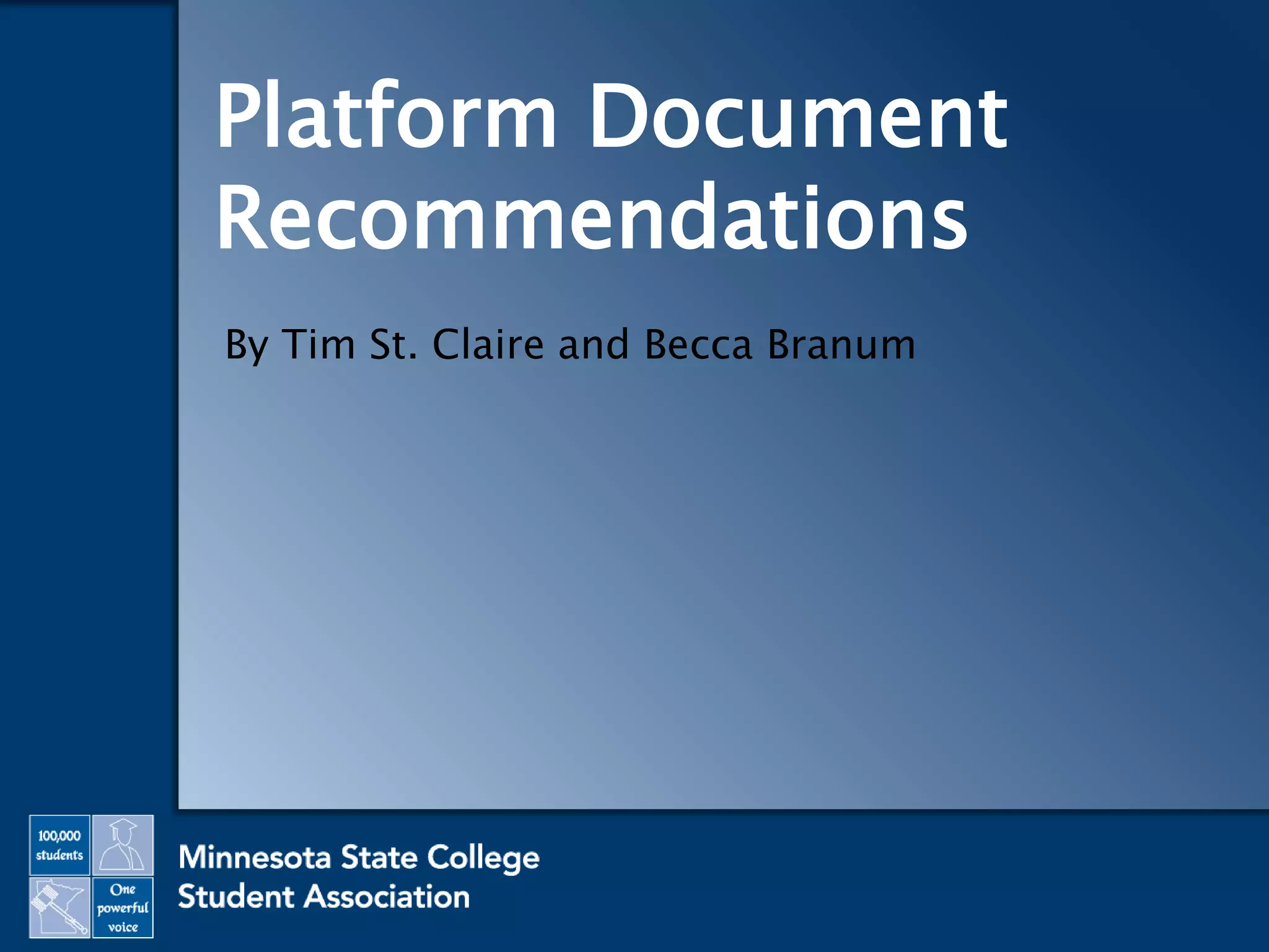 The platform document outlines MSC's official positions on various educational policies, including financial aid based on family income, support for in-state tuition for military families, and measures to increase funding for student services. It also details several legislative actions both supported and opposed by MSC, such as opposition to tuition models tied to inflation and discrimination. The committee responsible for this document consists of cabinet members and regional representatives, tasked with recommending changes for ratification.