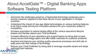 - AccelGate is a platform-led testing solution that enables banks to thoroughly test their digital applications to deliver defect-free, cost-efficient applications faster. It tests applications for functionality, compatibility, performance, and usability.