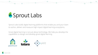 Sprout Labs develops digital learning platforms that allow organizations to create, deliver, and assess impactful learning ecosystems. Their offerings include features for upskilling, performance management, and engaging employees, emphasizing the importance of flexible and collaborative learning environments. They prioritize tailored solutions and continuous performance management to enhance workplace productivity and knowledge sharing.