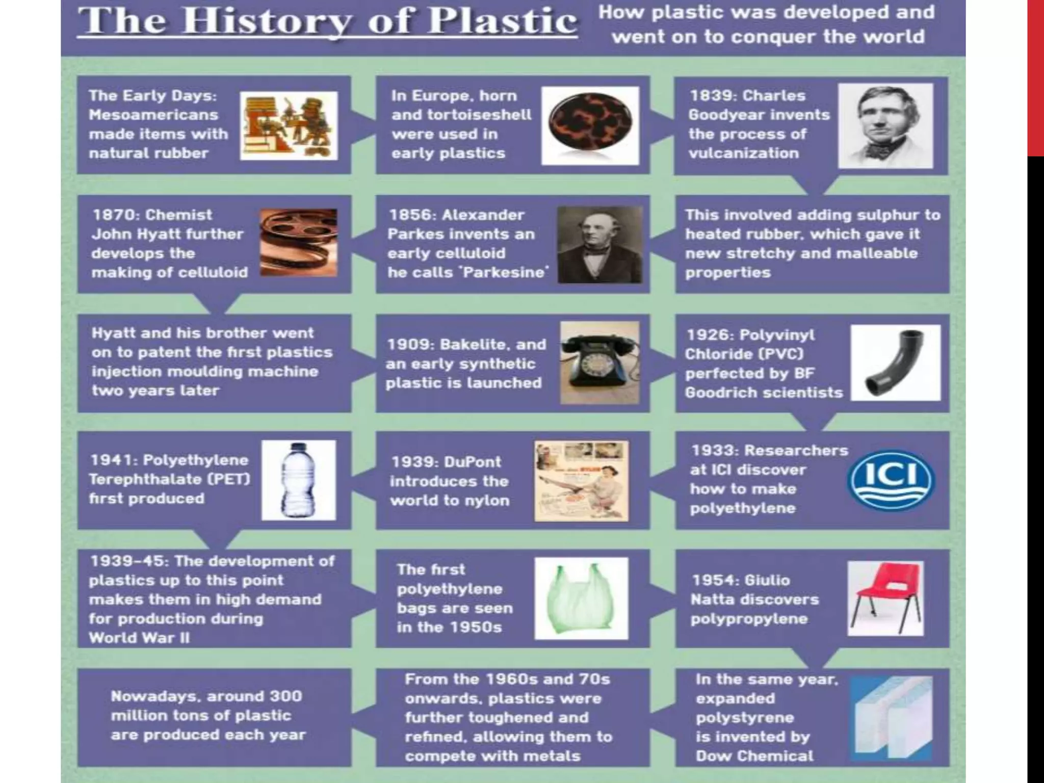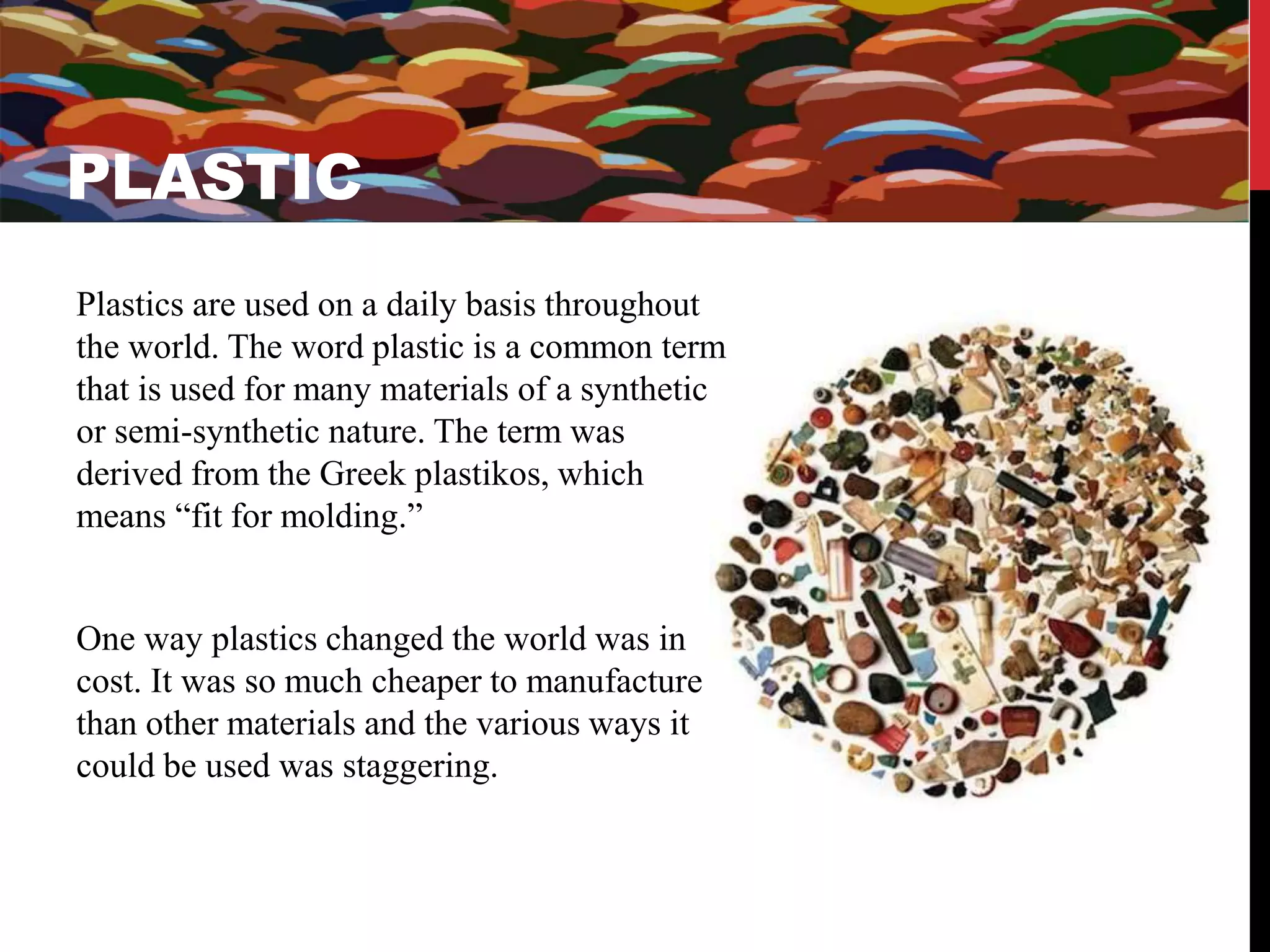 Plastics have become widely used in construction due to their low cost, versatility, and resistance to water. While early plastics were derived from natural sources, completely synthetic plastics later emerged. There are two main types of plastics - thermoplastics that can be reshaped with heat and thermosets that set permanently. Plastics are used in buildings for pipes, cables, flooring, windows, doors, tanks and more. They provide benefits like durability, light weight and resistance to weather, but also have limitations like degradation from sunlight and flammability without treatment.