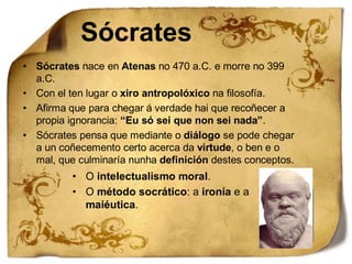 O xuízo deSócrates No ano 399 a.C., restablecida a democracia en Atenas, Sócrates é acusado de impiedade e de corromper á xuventude . No xuízo é condenado a morte por inxestión de cicuta . Despois dun mes na cadea, e rodeado de discípulos, se cumpre a sentenza.