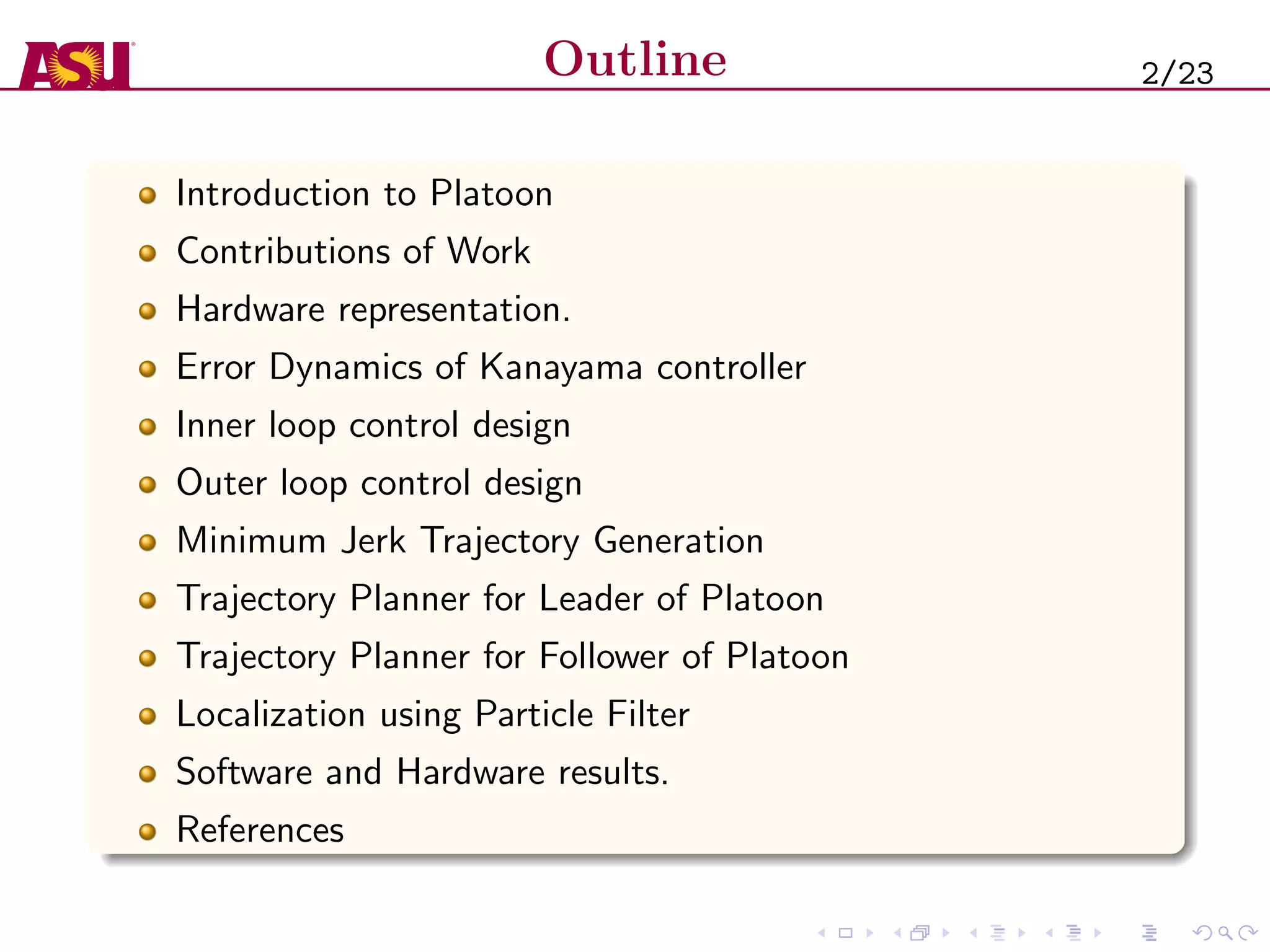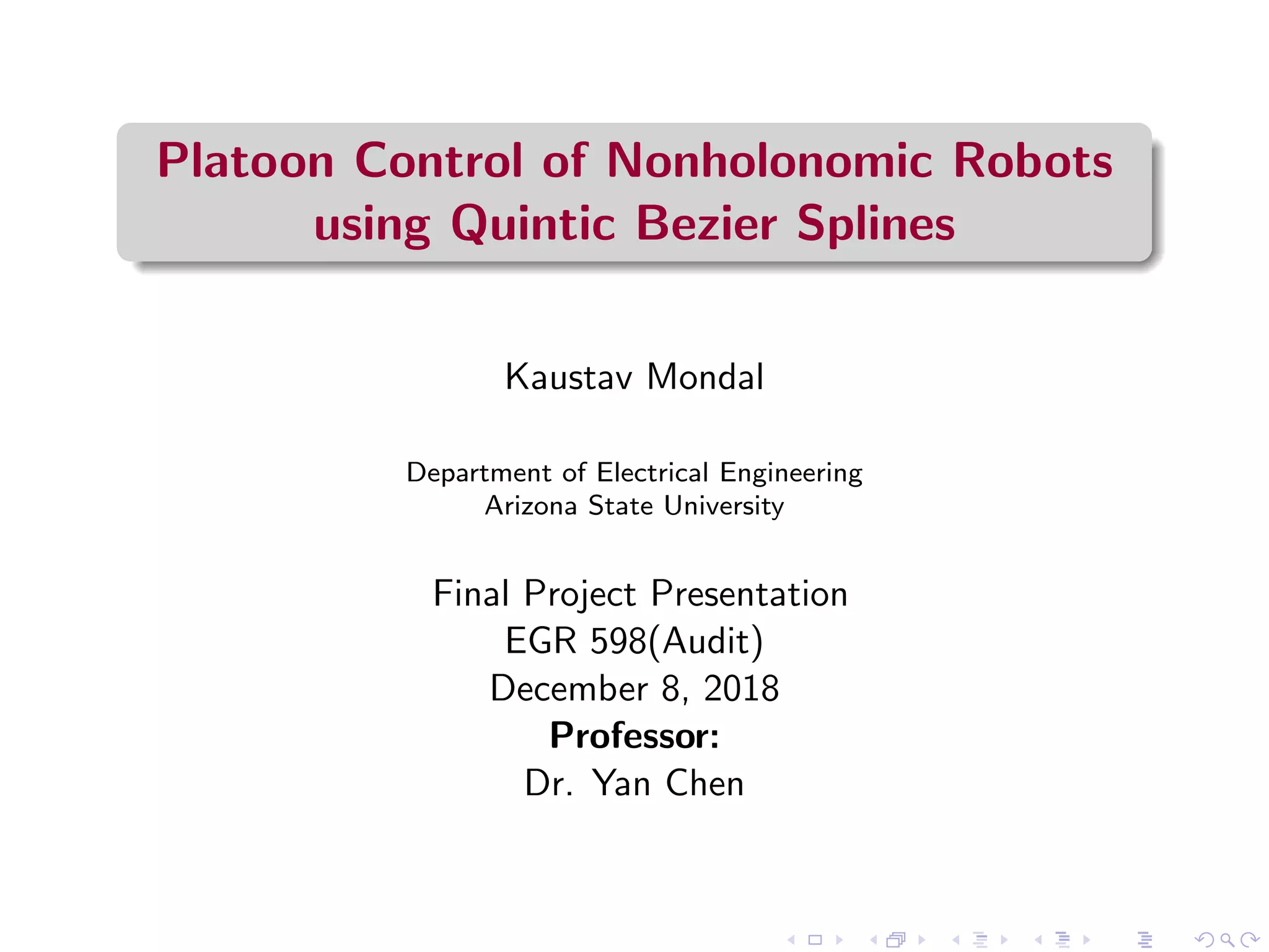 The document presents a final project on controlling nonholonomic robots in a platoon formation using quintic Bezier splines, focusing on algorithm development and hardware implementation. Key contributions include the creation of a minimum jerk trajectory planner and the application of the Kanayama nonlinear controller for real-time trajectory tracking. The work highlights advantages such as improved fuel efficiency and reduced collisions, alongside challenges related to string stability and potential security issues in inter-vehicular communication.