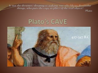 Plato, a significant philosopher, introduced concepts of democracy and the theory of forms through his dialogues, particularly in 'The Republic.' His allegory of the cave illustrates the struggle of individuals transitioning from ignorance to knowledge, emphasizing societal illusion and the pain of enlightenment. The document further explores modern political themes in India, contrasting the differing powers of political parties and the importance of informed decision-making among citizens.