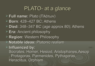 Plato was an ancient Greek philosopher born in 428 BC in Athens who studied under Socrates and founded the Academy in Athens, one of the earliest known organized schools. He was influenced by earlier philosophers like Socrates, Parmenides, and Pythagoras. Plato authored dialogues featuring Socrates discussing various philosophical ideas and established the foundations of Western philosophy focusing on ethics, politics, and epistemology.