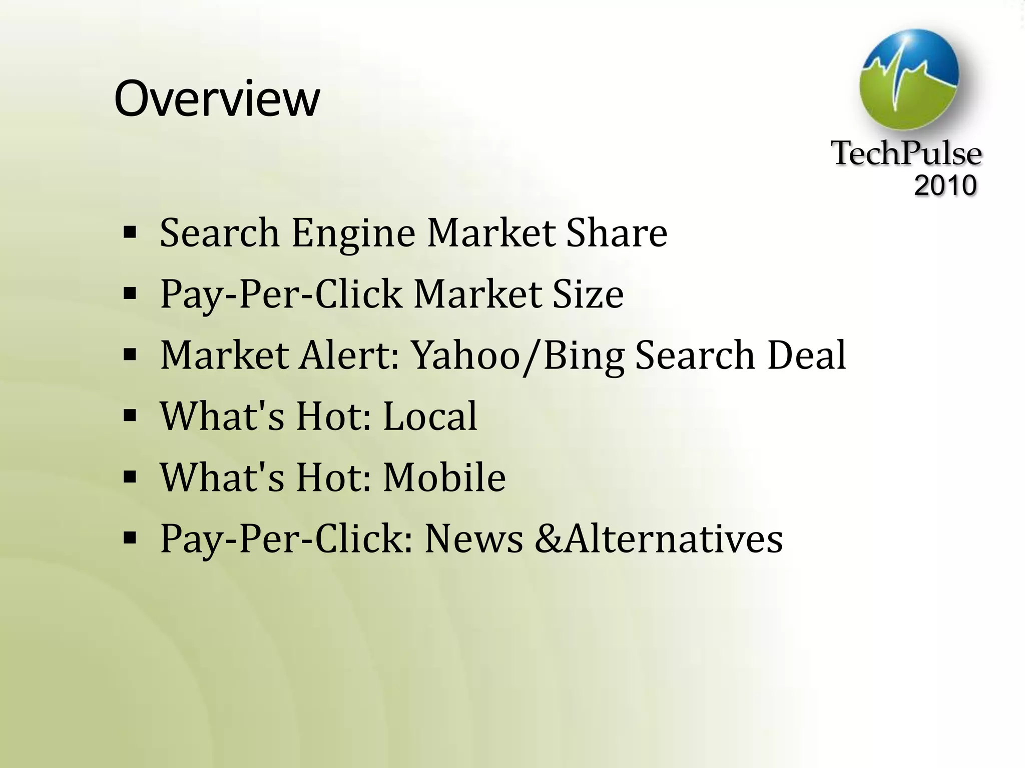 1) Google remains the dominant search engine and recipient of pay-per-click spending, though the Yahoo/Bing partnership may impact market share.