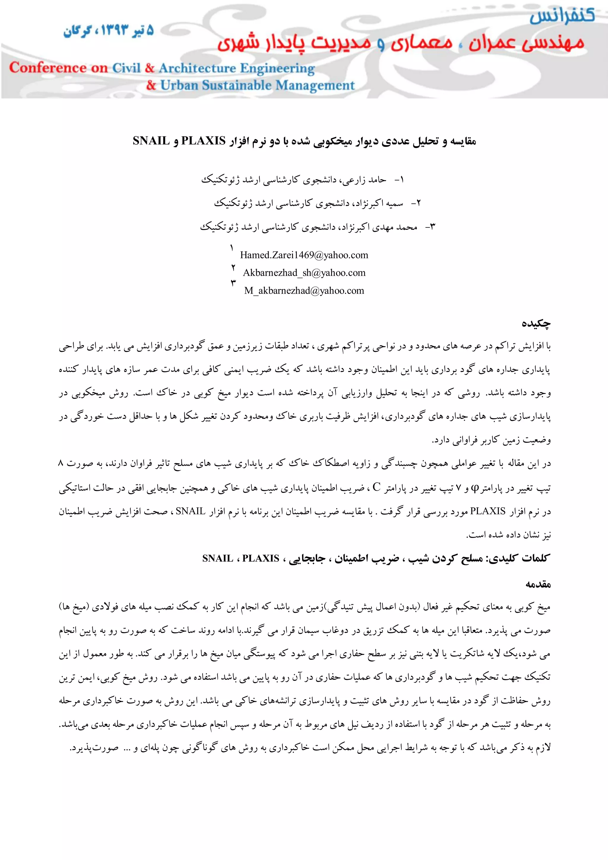 با شده میخکوبی دیوار عددی تحلیل و مقایسهPLAXISوSNAIL 1-حامدزارعیژئوتکنیک ارشد کارشناسی دانشجوی ، 2-اکبرنژاد سمیهژئوتکنیک ارشد کارشناسی دانشجوی ، 3-اکبرنژاد مهدی محمدژئوتکنیک ارشد کارشناسی دانشجوی ، Hamed.Zarei1469@yahoo.com Akbarnezhad_sh@yahoo.com M_akbarnezhad@yahoo.com چکیده .یابد می افزایش گودبرداری عمق و زیرزمین طبقات تعداد ، شهری پرتراکم نواحی در و محدود های عرصه در تراکم افزایش باطراحی برای کننده پایدار های سازه عمر مدت برای کافی ایمنی ضریب یک که باشد داشته وجود اطمینان این باید برداری گود های جداره پایداری داشته وجودب.اشد.است خاک در کوبی میخ دیوار است شده پرداخته آن وارزیابی تحلیل به اینجا در که روشیدر میخکوبی روش شی پایدارسازیبه جداره هایگودبرداری ایدر خوردگی دست حداقل با و ها شکل تغییر کردن ومحدود خاک باربری ظرفیت افزایش ، .دارد فراوانی کاربر زمین وضعیت مقاله این درصورت به ،دارند فراوان تاثیر مسلح های شیب پایداری بر که خاک اصطکاک زاویه و چسبندگی همچون عواملی تغییر با8 تیپتپارامتر در غییرφو7پارامتر در تغییر تیپCاستاتیکی حالت در افقی جابجایی همچنین و خاکی های شیب پایداری اطمینان ضریب ، افزار نرم درPLAXISافزار نرم با برنامه این اطمینان ضریب مقایسه با . گرفت قرار بررسی موردSNAILاطمینان ضریب افزایش صحت ، ش داده نشان نیز.است ده ، جابجایی ، اطمینان ضریب ، شیب کردن مسلح :کلیدی کلماتPLAXIS،SNAIL مقدمه )ها (میخ فوالدی های میله نصب کمک به کار این انجام که باشد می تنیدگی)زمین پیش اعمال (بدون فعال غیر تحکیم معنای به کوبی میخ در تزریق کمک به ها میله این متعاقبا .پذیرد می صورتانجام پایین به رو صورت به که ساخت روند ادامه گیرند.با می قرار سیمان دوغاب معمول طور به .کند می برقرار را ها میخ میان پیوستگی که شود می اجرا حفاری سطح بر نیز بتنی الیه یا شاتکریت الیه شود،یک میاین از د حفاری عملیات که ها گودبرداری و ها شیب تحکیم جهت تکنیک.شود می استفاده باشد می پایین به رو آن رروشکوبی میخترین ایمن ، ترانشه پایدارسازی و تثبیت های روش سایر با مقایسه در گود از حفاظت روشخاکی هایمیاین .باشدصورت به روشمرحله خاکبرداری آن به مربوط های نیل ردیف از استفاده با گود از مرحله هر تثبیت و مرحله بهمی بعدی مرحله خاکبرداری عملیات انجام سپس و مرحله.باشد می ذکر به الزمپله چون گوناگونی های روش به خاکبرداری است ممکن محل اجرایی شرایط به توجه با که باشدو ای...صورت.پذیرد 2 1 3