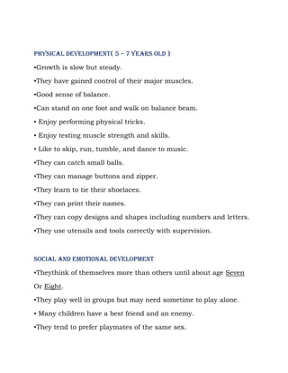 The document discusses play recommendations for school-age children between 5-12 years old. It outlines recommendations in three key areas: physical, social/emotional, and intellectual development. For physical development, it recommends activities like running, dancing, catching balls, and learning fine motor skills. For social/emotional development, it discusses the importance of peer relationships and developing moral understanding. For intellectual development, it notes an increasing attention span and ability to understand more complex stories and academic topics. It provides examples of age-appropriate play activities in each stage, like park play, arts and crafts, and team sports.