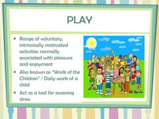 The document discusses play and its importance for child development. It outlines different types of play including social affective play, play with objects, language, skills, motion, nature, and social materials. It describes the physical, intellectual, moral, creative, therapeutic, and socialization values of play. Parten's stages of play are explained including unoccupied, onlooker, solitary, parallel, associative, and cooperative play. Other types of play that contribute to maturity are also outlined such as dramatic, competitive, physical, constructive, and medical play. The characteristics and purposes of medical play are then defined.