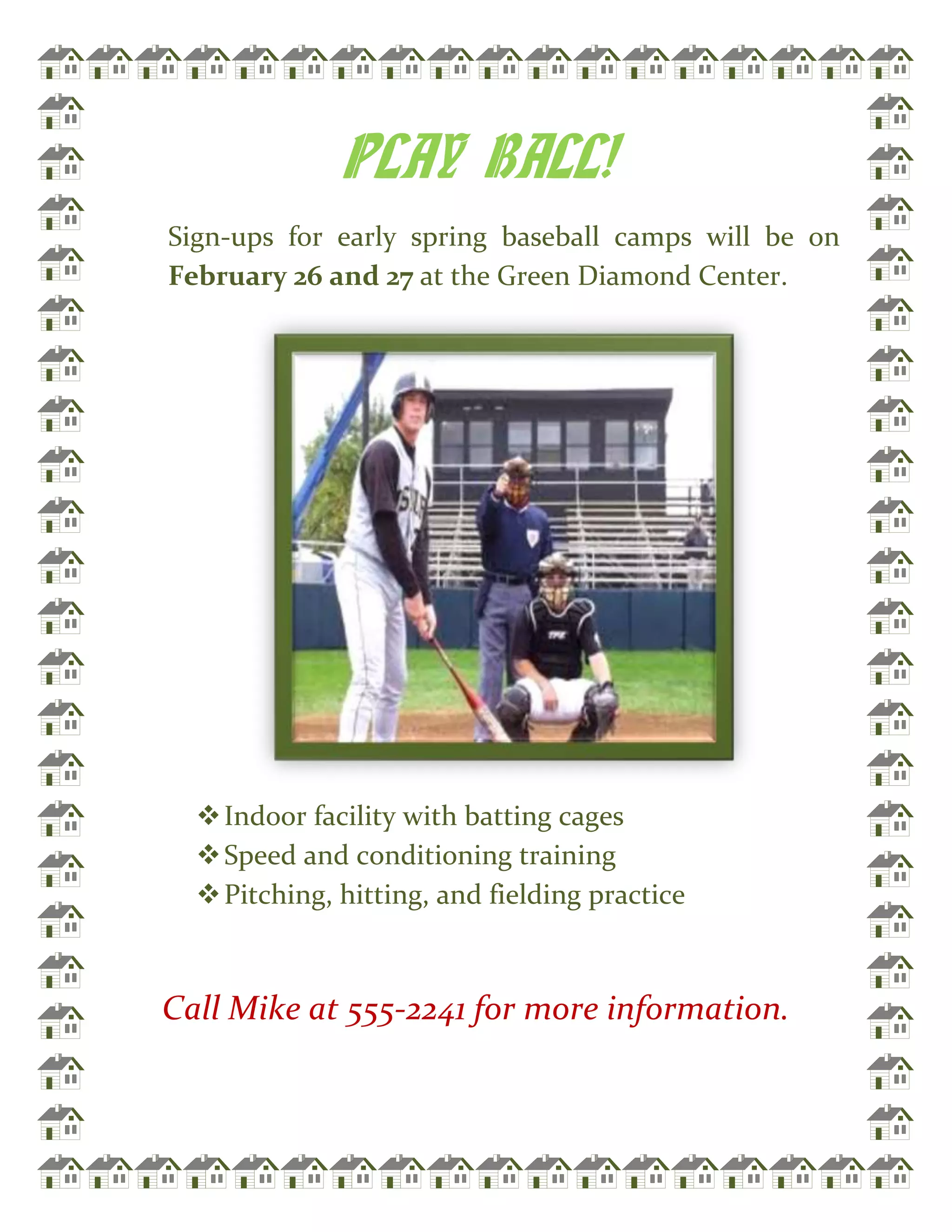 Sign-ups for early spring baseball camps will be held on February 26th and 27th at the Green Diamond Center, which features an indoor facility with batting cages. The camps will include speed and conditioning training as well as practice for pitching, hitting, and fielding. Those interested can call Mike at 555-2241 for more details.