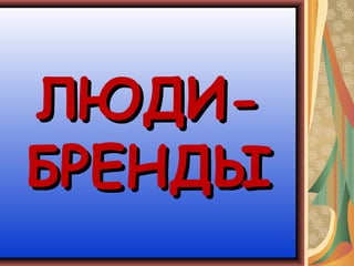 Документ описывает разнообразных личностей, которые стали известными благодаря своим достижениям и создали влиятельные бренды, такие как герой войны, кондитер и дизайнер. Каждый персонаж представлен как 'человек-бренд', который оставил важный след в истории. Работа Елены Рог 'Люди – бренды' служит основой для обсуждения этих историй успеха.