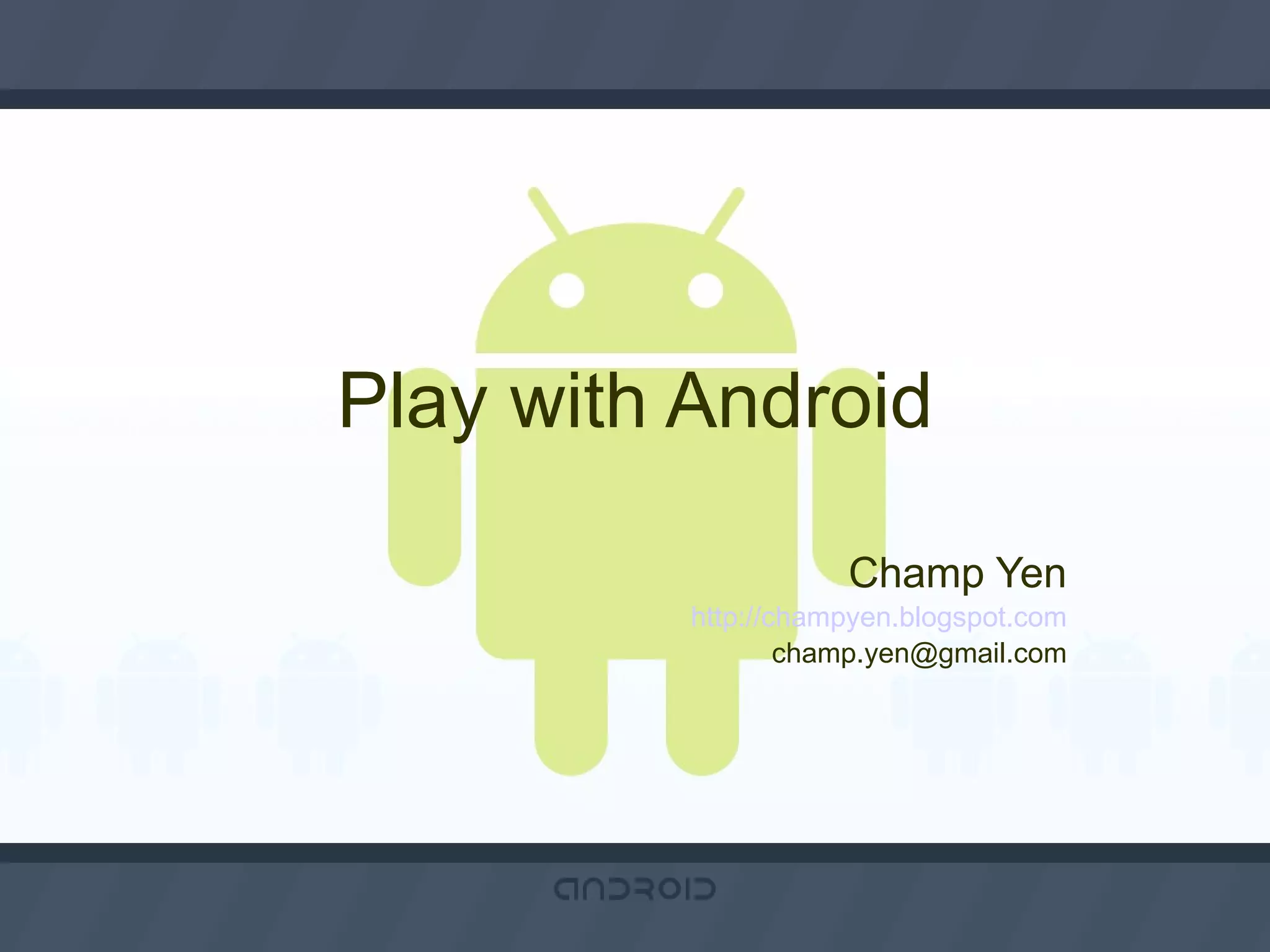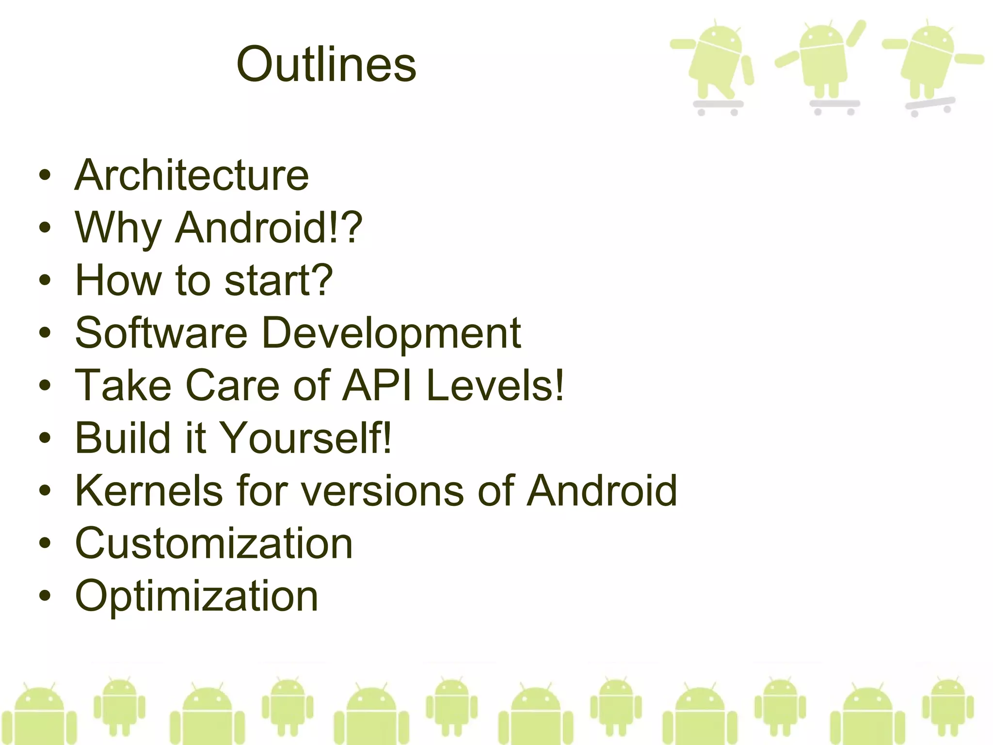The document discusses various topics related to developing and customizing the Android operating system, including its architecture, how to get started, software development practices, API levels, building the system, kernel versions, customization, and optimization. It provides resources for porting Android to different hardware platforms like x86, ARM, and MIPS devices.