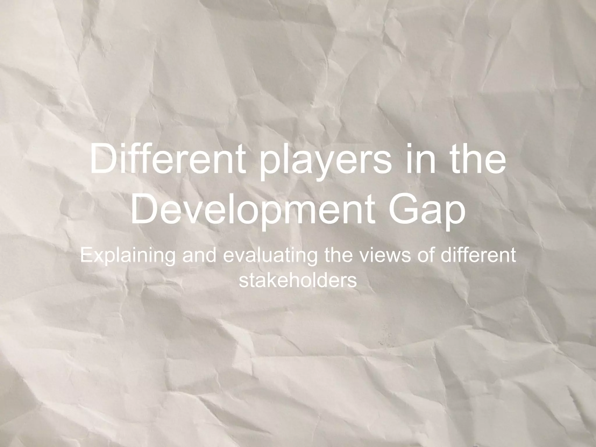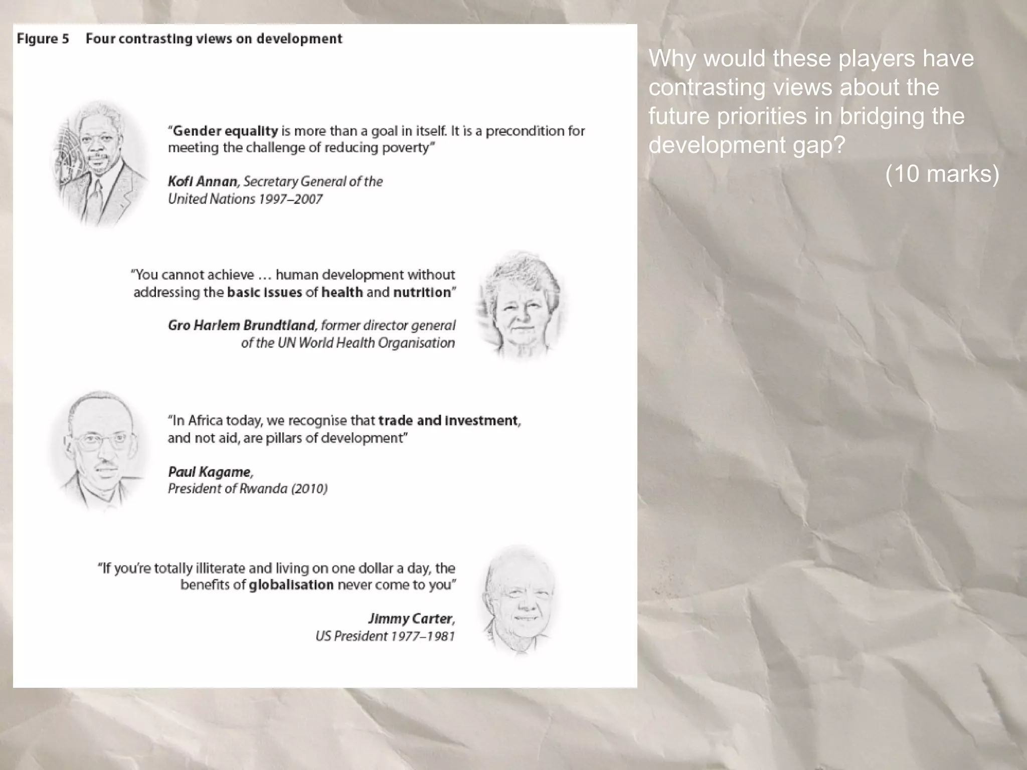 Kofi Annan believes reducing inequality between men and women is key to bridging the development gap. Improving access to basic services like education and healthcare would help boost quality of life from the bottom up. A local business owner prioritizes economic growth through infrastructure to create jobs. A grassroots activist focuses on empowering people through participation in decisions affecting their lives. While their priorities differ, all acknowledge development as a complex, multi-dimensional process requiring action at both global and local levels.