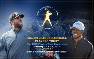 This document describes the 2017 Players Trust Experience, which provides opportunities to interact with Major League Baseball players and support the Players Trust charity foundation. The two-day event in Las Vegas includes a golf tournament, poker tournament, and welcome dinner party with current and former MLB all-stars. Sponsorship packages are available to support the Players Trust programs that benefit underprivileged youth through baseball activities.