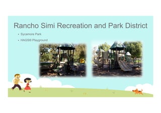 This document summarizes playground safety inspections from several parks. At Sycamore Park, the tallest slide was 6 feet with a 22 inch exit height, while swings were 9 feet off the ground. Inspections found violations of exposure standards at Winnetka and Reseda Parks due to bolts, rust, and tripping hazards. Mammoth Park was found to meet all exposure standards with low slides, protective surfacing, and no sharp edges. While materials were mostly smooth, small areas where feet could get caught were noted.
