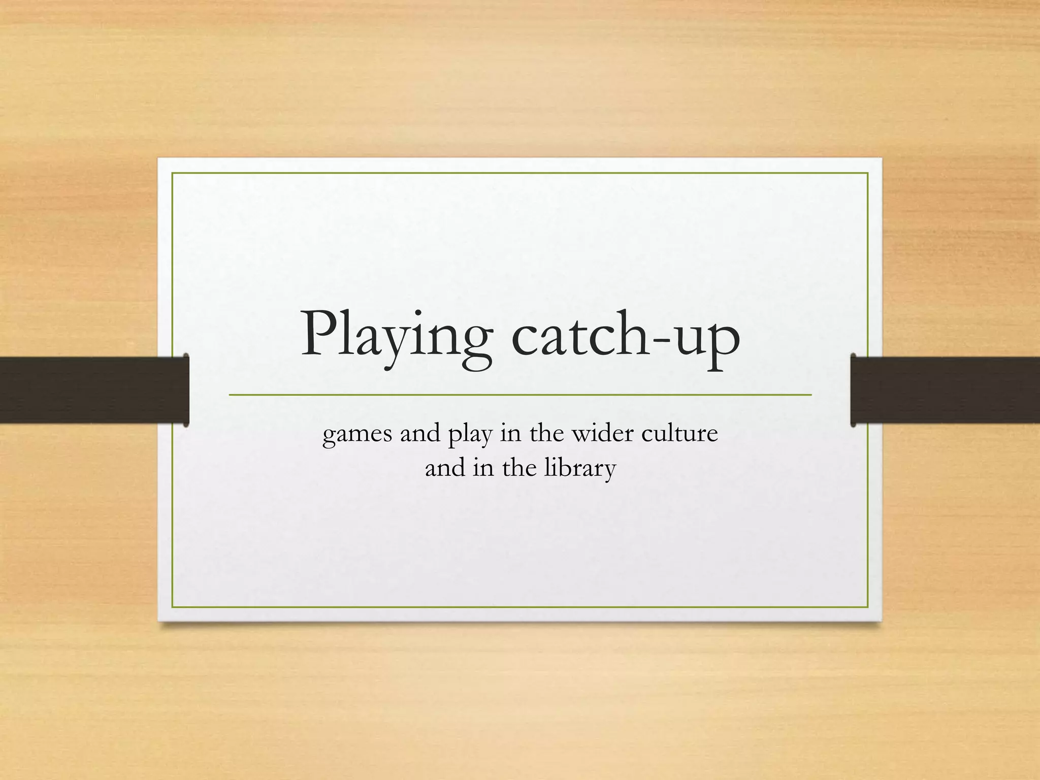 The document discusses the importance of incorporating play and games into library culture, emphasizing the value of challenge, learning, and community-building that play offers. It outlines the agenda for a workshop focused on understanding the state of games in libraries, exploring potential opportunities and obstacles, and fostering critical discussion about games and play. The text also highlights the cultural significance of games, their role in education, and the need for libraries to adapt to include more playful and interactive elements.
