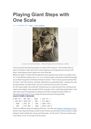 This document discusses using a single augmented hexatonic scale to solo over the chord changes in John Coltrane's "Giant Steps". It describes how the scale contains notes that fit over the major, dominant 7th, and half-diminished chords in the progression. While it requires ignoring or reharmonizing some chords, the scale provides intervals like semitones, minor 3rds, and major 7ths that can be combined fluently. Using this scale allows treating "Giant Steps" almost like a modal tune and provides its own distinctive polytonal sound.