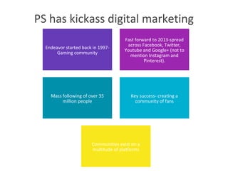 PlayStation has been developing its digital marketing presence since 1997 and now has a gaming community of over 35 million people across multiple social media platforms. It has been successful due to creating an engaged community of fans. PlayStation utilizes its e-commerce platform and store to sell games without explicitly segmenting customers. It encourages fan participation through polls and surveys on its social media posts. PlayStation saw potential for growth on Twitter and worked to increase engagement through consistent, concise messaging that encouraged interaction. This led to 60% more tweets about PlayStation, 55% more positive content, and 88% more followers on Twitter, taking its social media reputation to the next level.