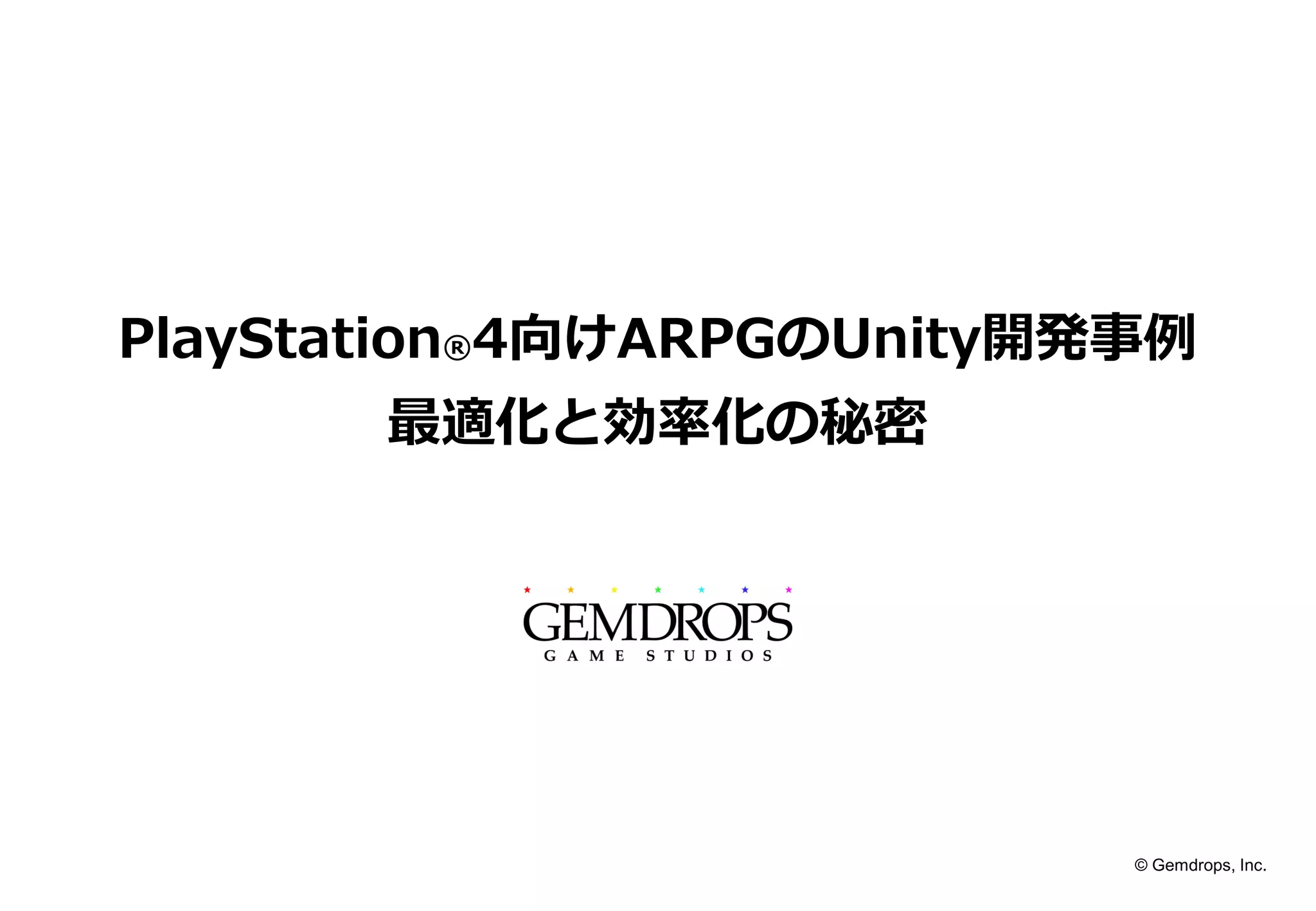 2018年11月10日に開催された「どっかんナゴヤ」の講演スライドです。 フリュー株式会社さまより発売されました PS4 向けゲーム「CRYSTAR -クライスタ-」のUnity開発事例となります。 ジェムドロップ株式会社 北尾 雄一郎 (代表取締役 / スタジオディレクター) 吉川 英雄 (プログラムディレクター)