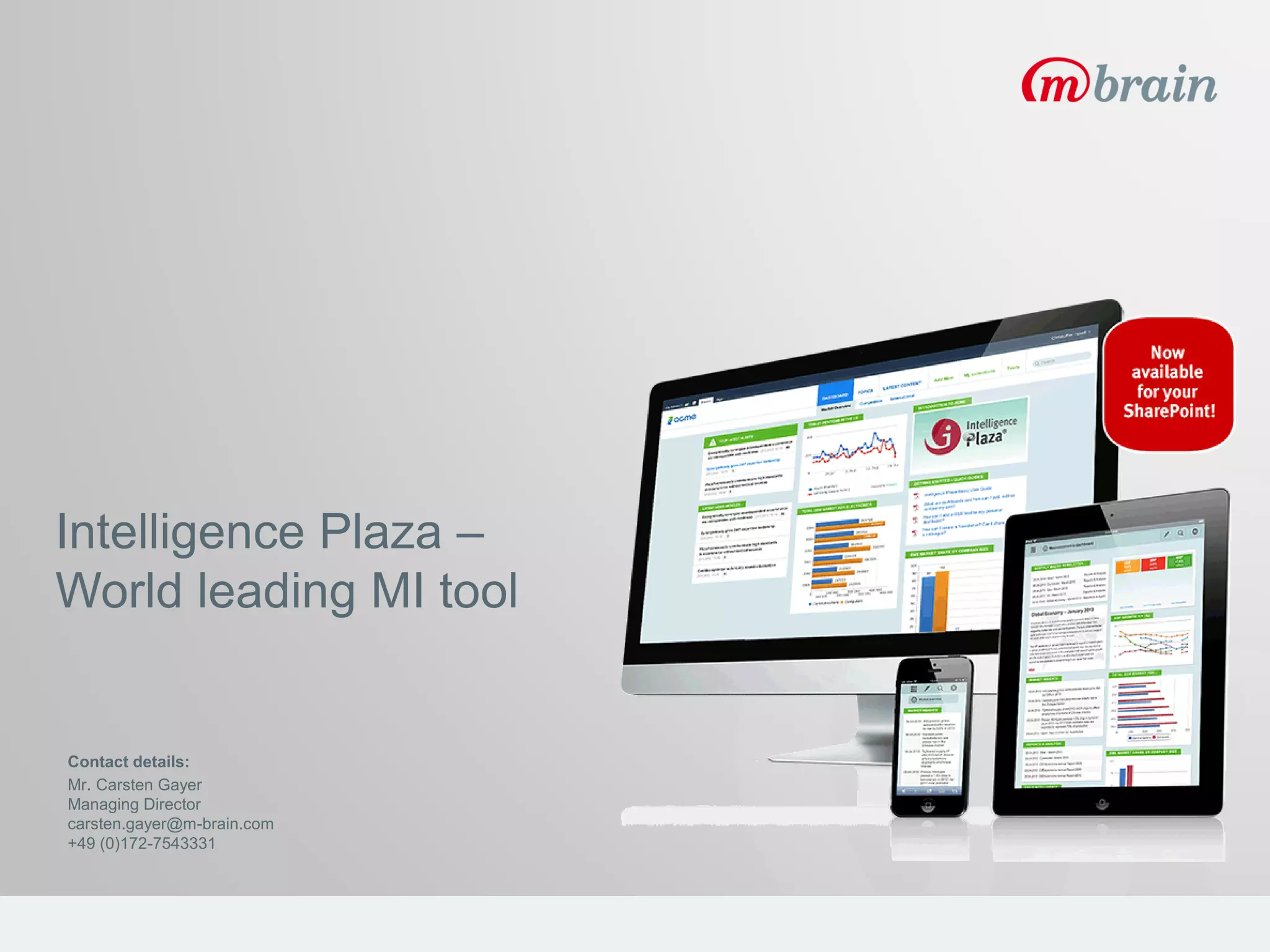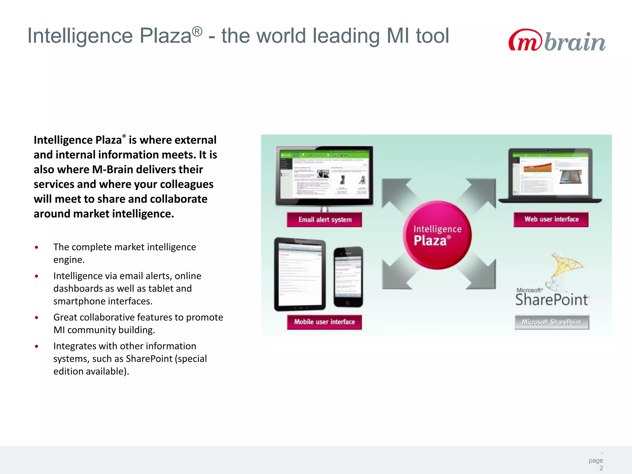 Intelligence Plaza is a leading market intelligence tool from M-Brain that facilitates collaboration and information sharing through advanced features like personalized alerts, modular information architecture, and integration with other business systems. It is designed for ease of use, quick implementation, and continuous development based on user feedback. M-Brain offers additional customized intelligence deliverables and services to meet specific organizational needs.