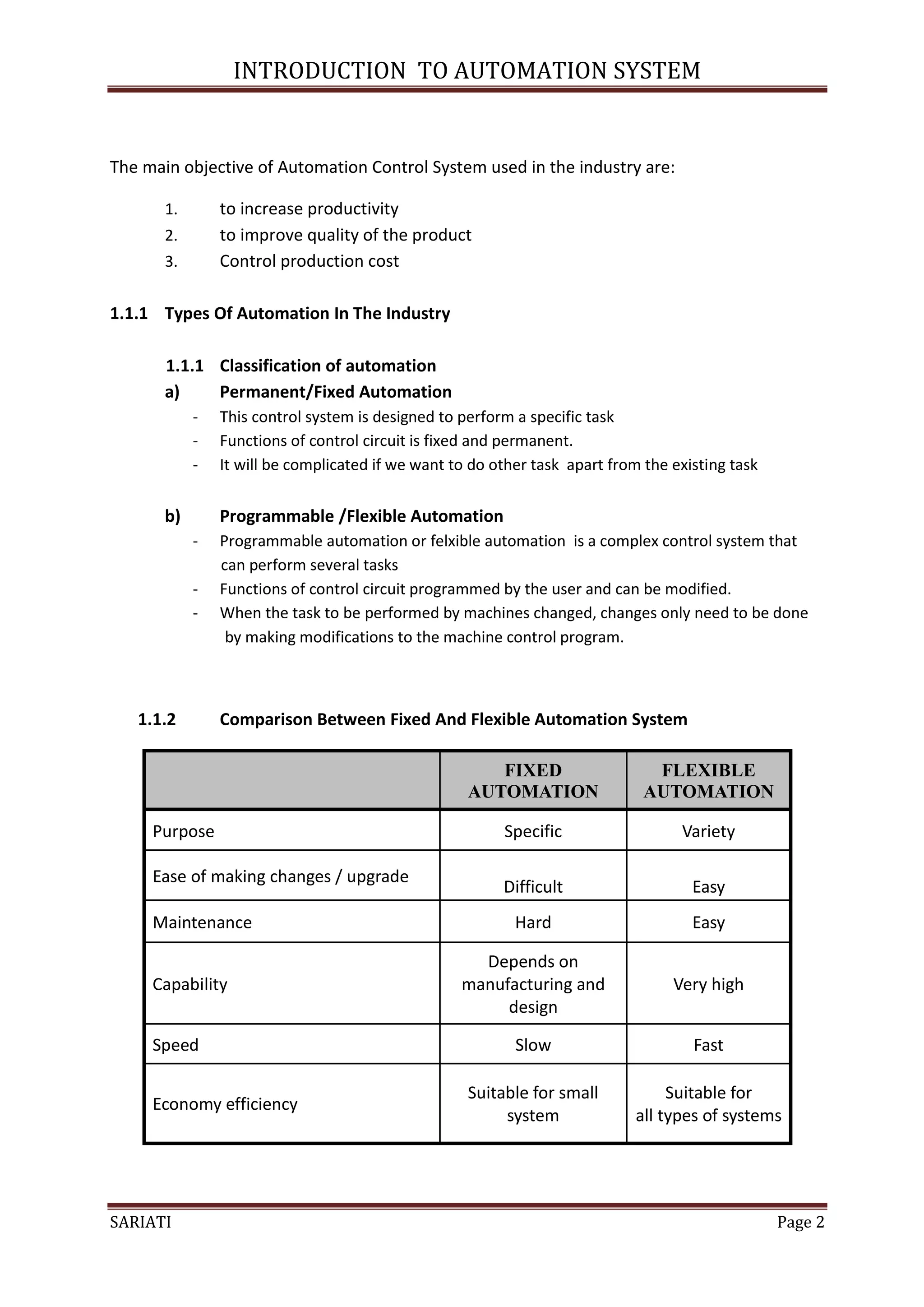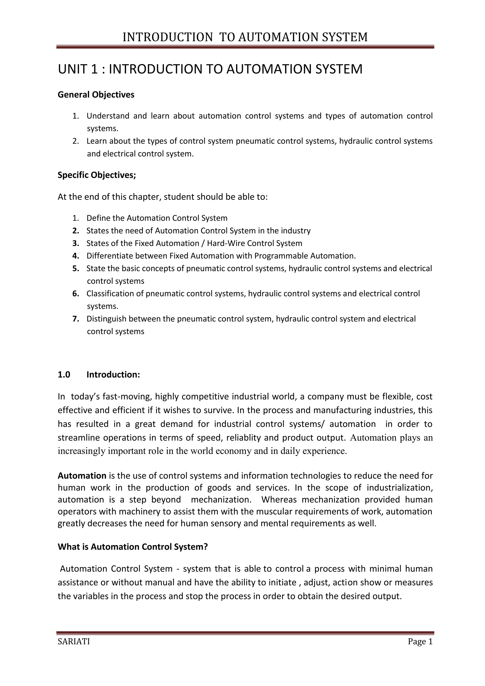 The document provides an introduction to automation systems. It defines automation control systems and discusses fixed and programmable automation. There are three main types of control systems based on the supply source: pneumatic, hydraulic, and electrical. Pneumatic systems use compressed air, hydraulic systems use fluid like oil, and electrical systems use electricity. Relays and contactors are also discussed, with relays used for smaller loads and contactors for larger loads like motors. Examples of how they are used in circuits are provided.