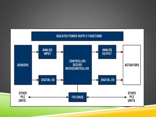 The document provides a comprehensive overview of Programmable Logic Controllers (PLCs), including their architecture, hardware components, types of memory, and input/output modules. It highlights the evolution of PLCs from relay controllers to semiconductor logic controllers, emphasizing advantages like adaptability and minimal maintenance. It also discusses communication units and the advantages and disadvantages of PLC systems in industrial applications.