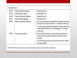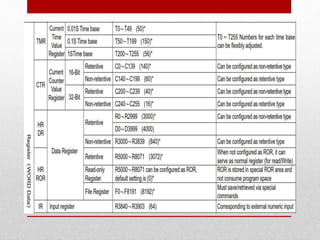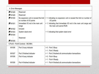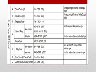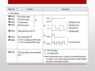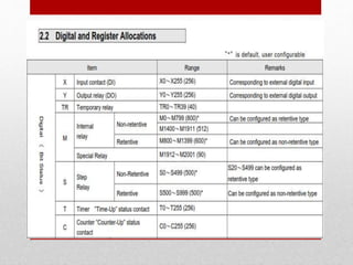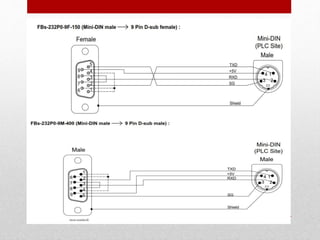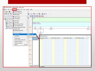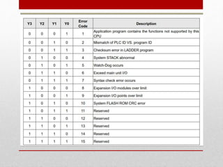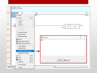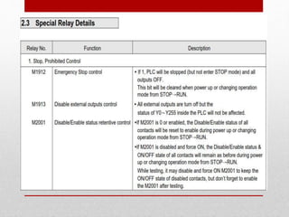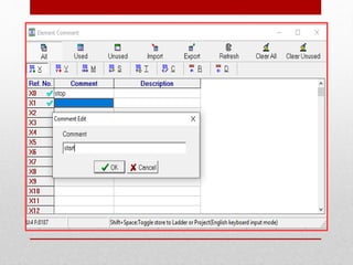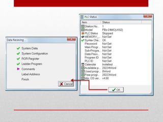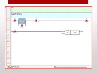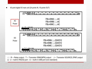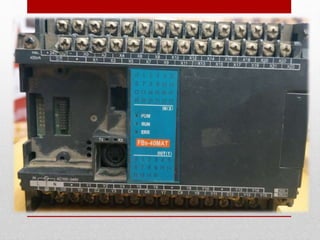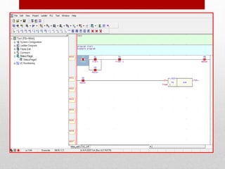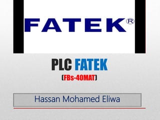 This document provides information about PLC FATEK (FBs-40MAT) including descriptions of its digital input and output circuits, LED indicators, communication ports, input and output status indicators, and how to create and test a sample ladder logic program using WinProladder software. It describes how to input and annotate a sample program testing inputs X0 and X1 to control output Y0 using a T0 timer, save the program to the PLC, run and debug the program simulation, and monitor I/O status.
