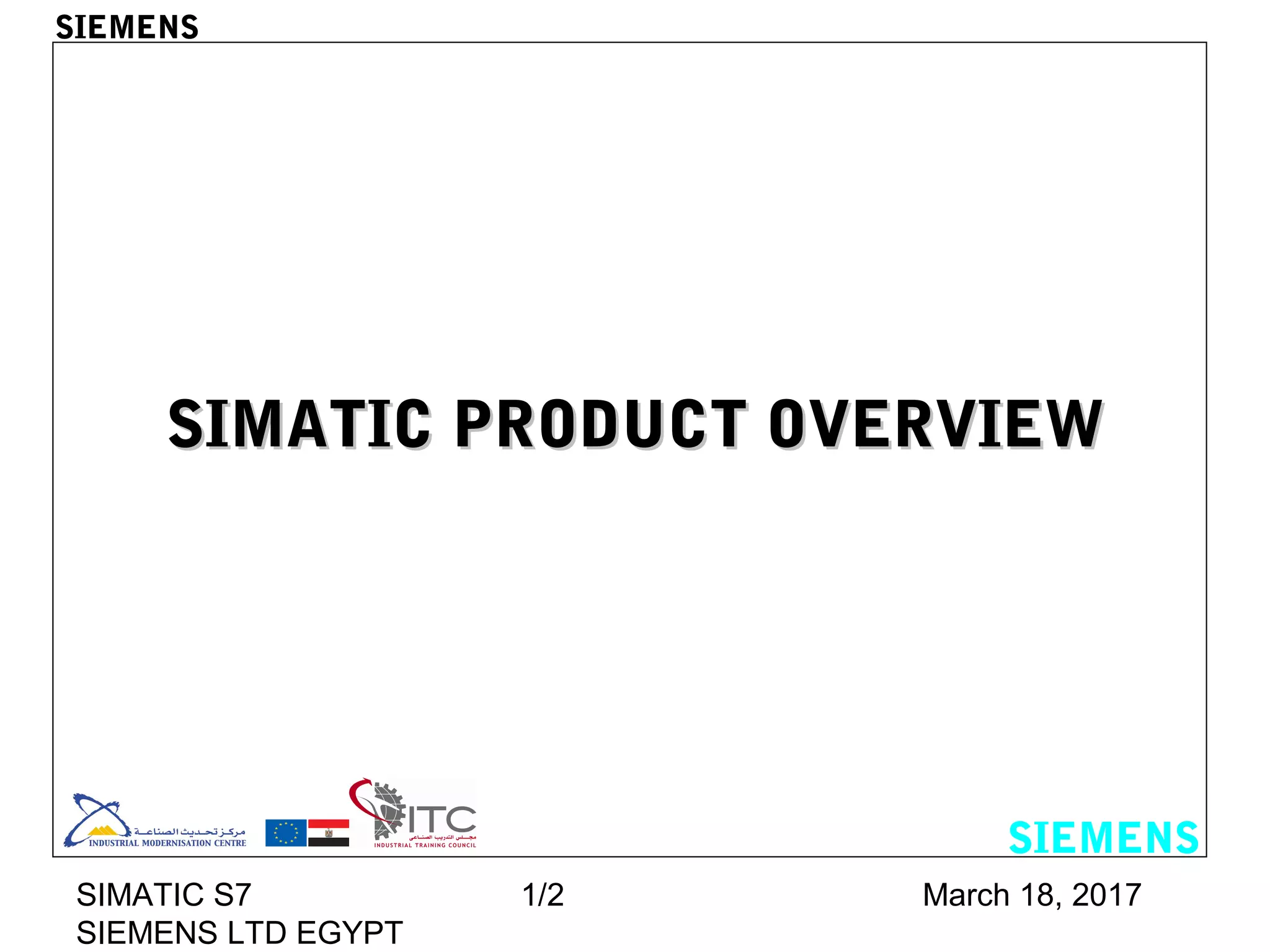 The document provides an overview of Siemens' SIMATIC product line, including the S7-200, S7-300, and S7-400 programmable logic controllers. It describes the different CPUs, modules, and programming devices for each series. The S7-200 is for simple automation tasks, the S7-300 is for medium to large applications, and the S7-400 is high-performance for demanding plant applications. It discusses the various bus systems, signal modules, and communication options available for connecting and programming each PLC.