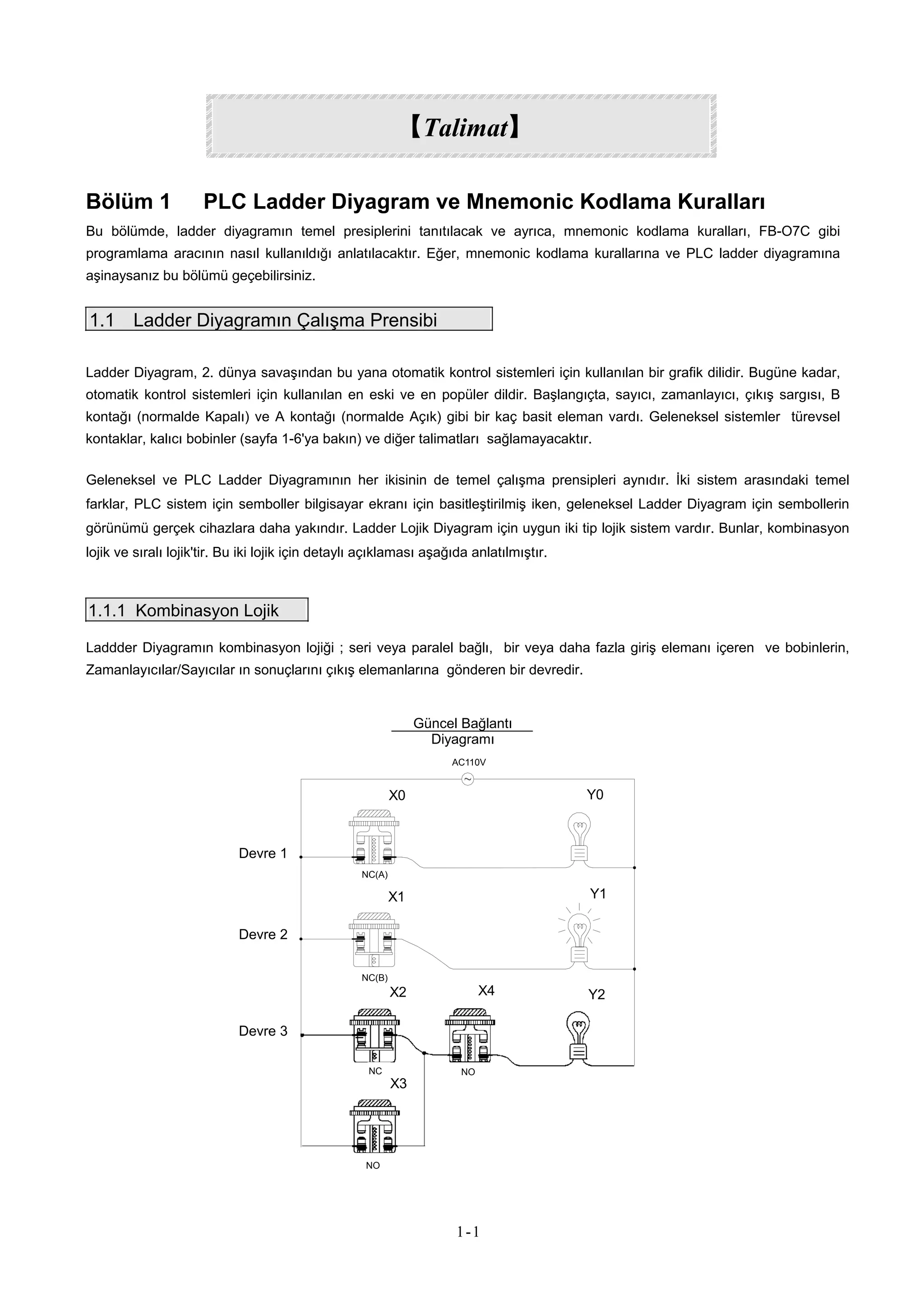 Bu bölümde, ladder diyagramın temel presiplerini tanıtılacak ve ayrıca, mnemonic kodlama kuralları, FB-O7C gibi