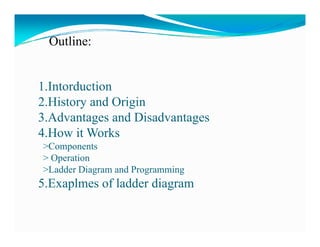 (1) An overview of PLCs, their history and components. PLCs were developed to replace relays and are used to automate industrial processes.