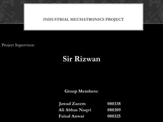 The document describes an industrial mechatronics project to design a material mixing and bottle filling station. There are three containers with level sensors that determine when material is present, and their valves open to fill a large mixing container. That container has sensors to determine the upper and lower material levels, and a motor mixes the material until the upper level is reached. A "Ready" signal then indicates the material can be filled into bottles on a conveyor belt, which runs until a bottle is detected by a sensor and the valve opens to fill it, closing once the bottle's level sensor is triggered. This process repeats for six bottles before a "Feed required" signal notes the material needs refilling.