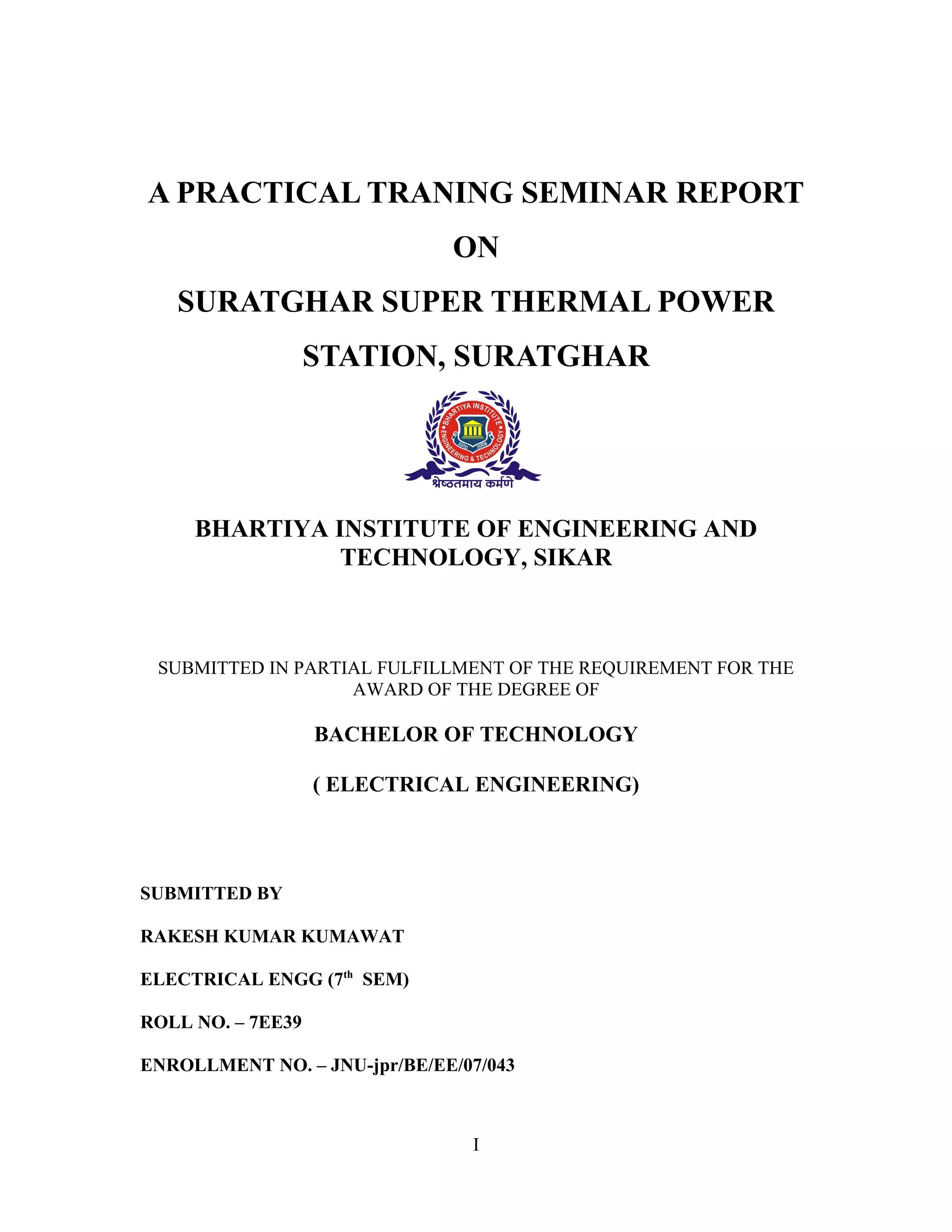 Rakesh Kumar Kumawat completed a 45-day practical training at the Suratgarh Super Thermal Power Station in Suratgarh, India. The report describes the various equipment used at a thermal power plant, including the coal handling plant, boiler, turbine, condenser, cooling tower, and other auxiliary equipment. It provides details on the working and components of key systems like the coal pulverization process, types of boilers and turbines, condenser, air preheater, and electrostatic precipitator. The report was submitted in partial fulfillment of the Bachelor of Technology degree in electrical engineering from Bhartiya Institute of Engineering and Technology, Sikar.