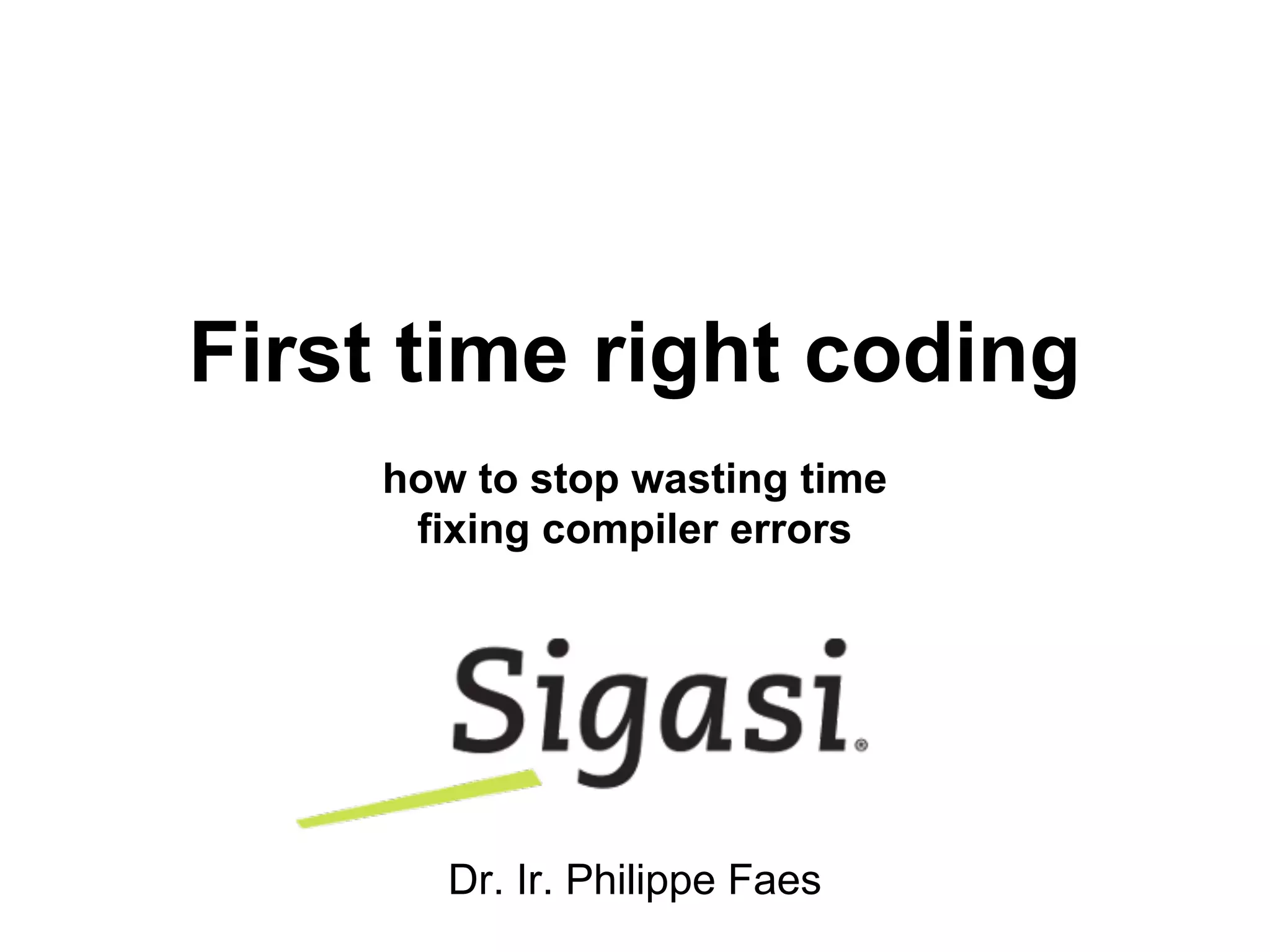 This document discusses first time right coding, which involves writing code that compiles without errors from the first attempt. It recommends setting up automatic compilation when files are saved or typed to catch errors early. This prevents wasting time fixing errors and avoids checking in broken code. Various IDE tools are mentioned that can help with incremental compilation and catching syntax, type, and other errors at compile time rather than later.