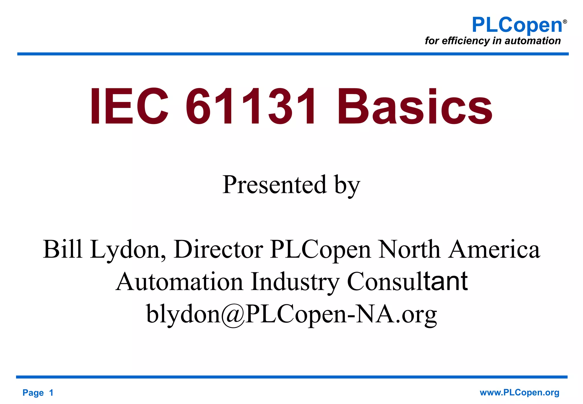 The document discusses the benefits of standardizing PLC software. It describes how standardization improves productivity, quality, and reliability by reducing development costs. It then provides an overview of IEC 61131-3, the international standard for PLC programming, including its data types, languages like ladder logic and structured text, and programming concepts like function blocks. The document advocates for using standardized software and languages to improve reliability, productivity, and maintenance efficiency for automation systems.