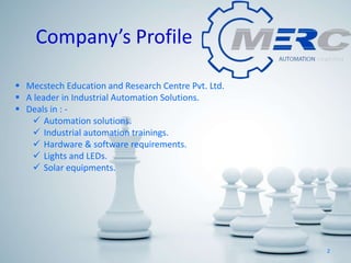 The document is a presentation on industrial automation using PLC and SCADA. It discusses Mecstech Education and Research Centre which deals in automation solutions, trainings, and hardware/software requirements. It then covers what a PLC is, its significance in automation, leading brands of PLCs, and features of PLCs like inputs, outputs, power supply. The presentation also discusses SCADA's importance in reducing human effort and providing real-time data, goals of SCADA, prominent SCADA brands, and features like process graphics, alarms, trends and database connectivity. It concludes with applications of automation and PLC-SCADA demonstrations.