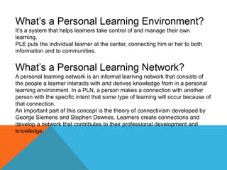 This document discusses personal learning environments (PLEs) and personal learning networks (PLNs). A PLE is a system that allows learners to take control of and manage their own learning by connecting them to information and communities. A PLN is an informal learning network consisting of the people a learner interacts with and learns from within their PLE. An important aspect is connectivism theory, where learners create connections through their network to aid professional development and knowledge.