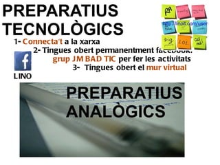 PREPARATIUS TECNOLÒGICS 1- Connecta't a la xarxa 2- Tingues obert permanentment facebook: grup JM BAD TIC per fer les activitats 3- Tingues obert el mur virtual LINO PREPARATIUS TECNOLÒGICS PREPARATIUS ANALÒGICS http://linoit.com/users/jluisbloc/canvases/PASSOS PER APRENDRE