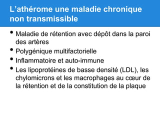 This document discusses the role of chronic inflammation in cardiovascular diseases related to atherosclerosis. It notes that atherosclerosis is a chronic non-communicable disease involving the retention and deposition of lipids in artery walls. Chronic inflammation and autoimmune processes are involved in atherosclerosis. Diet and other lifestyle factors like smoking and physical inactivity can promote chronic inflammation and accelerate the development of atherosclerosis. Anti-inflammatory diets high in whole foods, omega-3 fatty acids, and spices are recommended to reduce inflammation and cardiovascular risk.