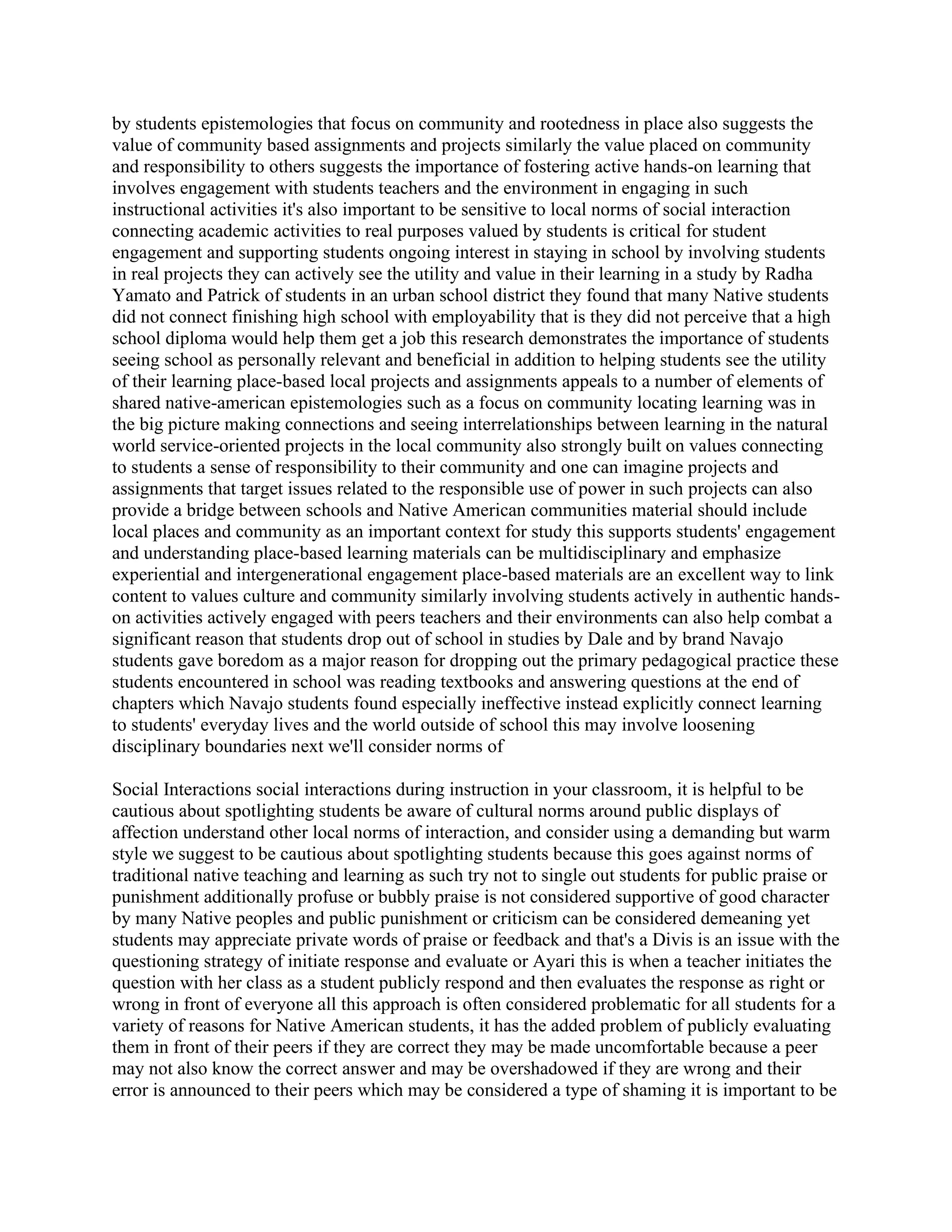 The document outlines guidelines for implementing culturally responsive instruction for Native American students, emphasizing the importance of student choice, traditional teaching methods like storytelling, and community-based learning. It highlights the necessity of adapting instructional strategies to respect cultural norms and fostering relationships between teachers and students to enhance engagement. Teacher attitudes are crucial for student success, and the paper urges educators to reflect on their practices to better support Native American learners.